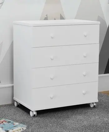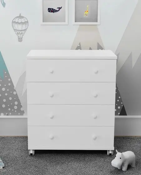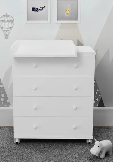 Пеленальная доска с защитными бортиками на комоде съёмная, её легко можно передвигать в любую сторону комода или полностью убрать, когда ребёнок подрастет. Использование комода облегчит родителям уход за ребёнком во время гигиенических процедур.