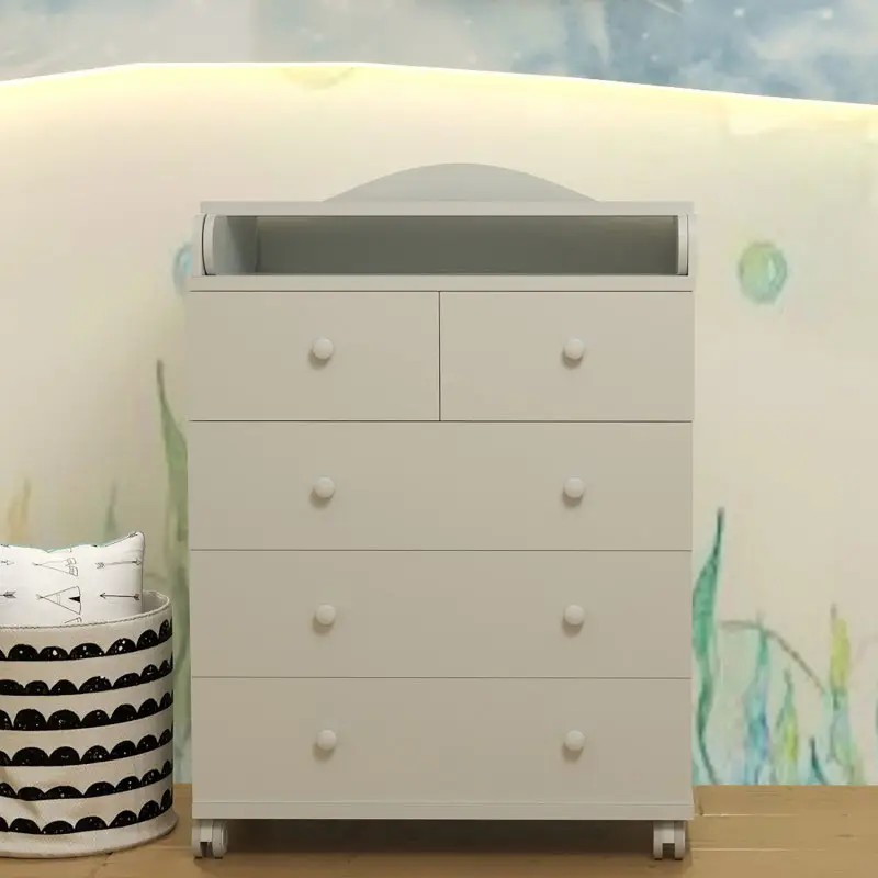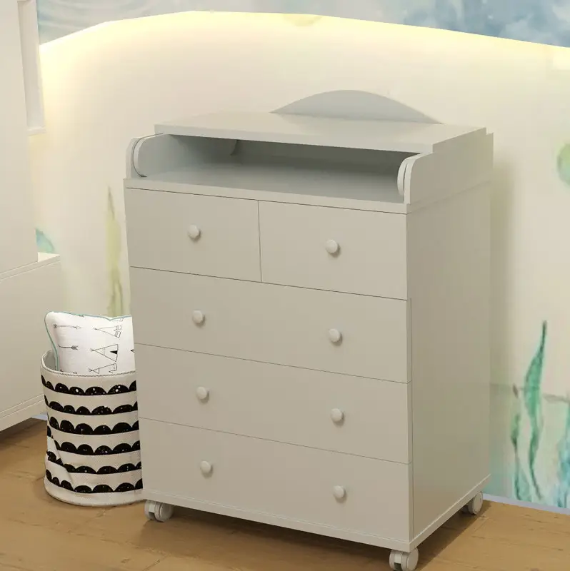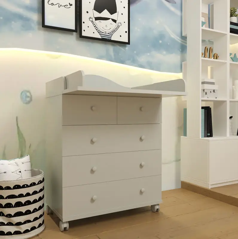 Верхний ящик поделен на два небольших, что упрощает хранения различных мелочей, а откидной столик легко убирается, позволяя существенно сэкономить место в комнате. Прорезиненные колеса у основания помогут в пару мгновений переместить комод в нужное место.