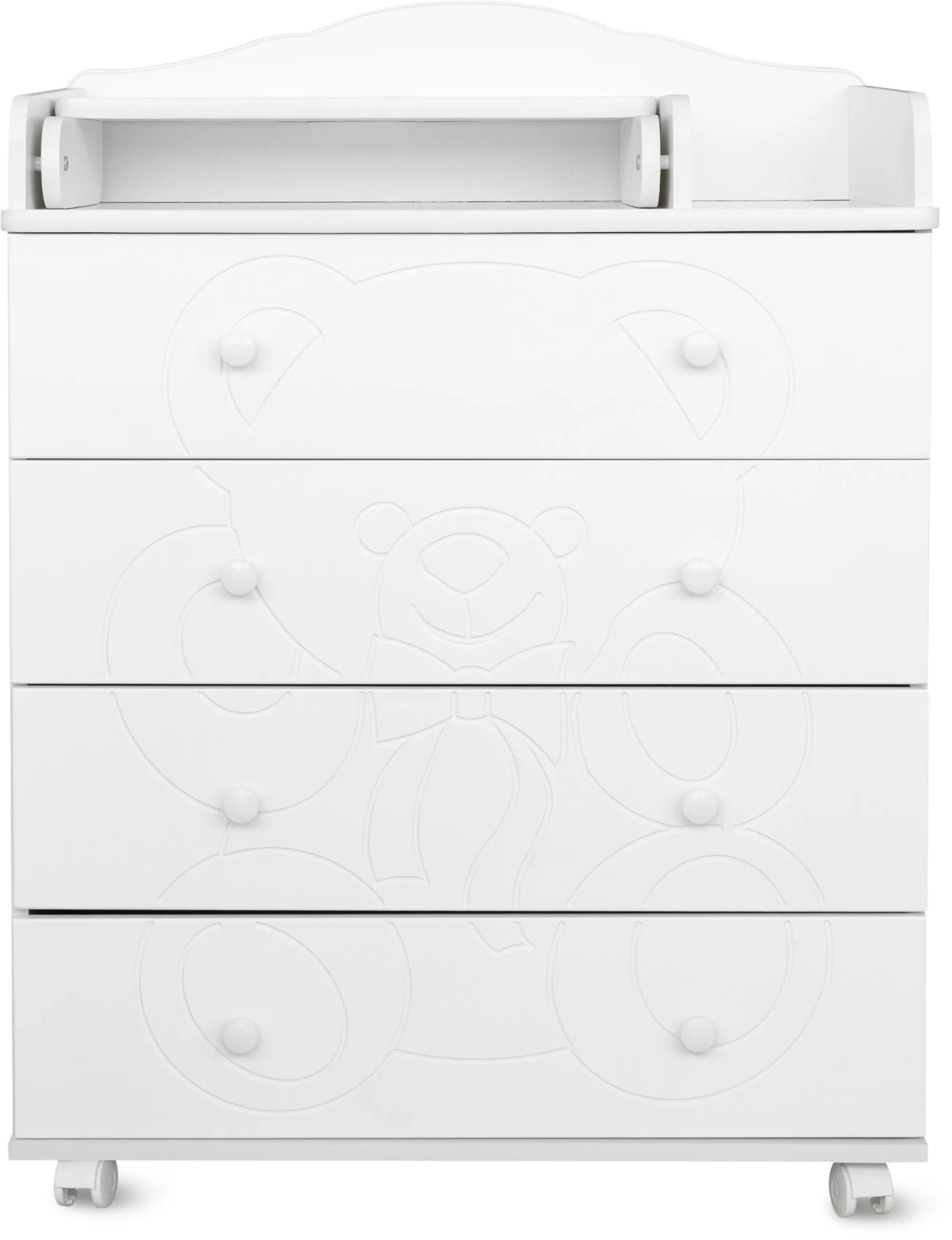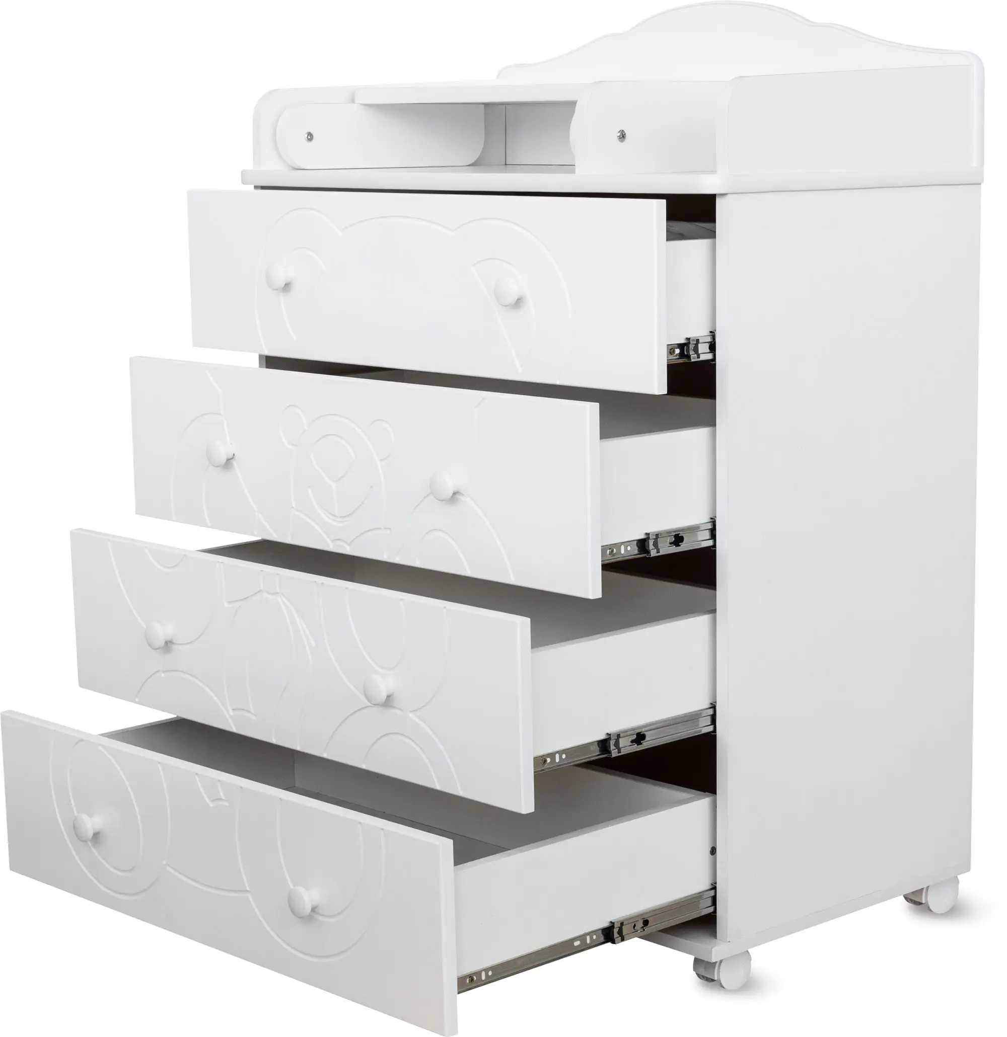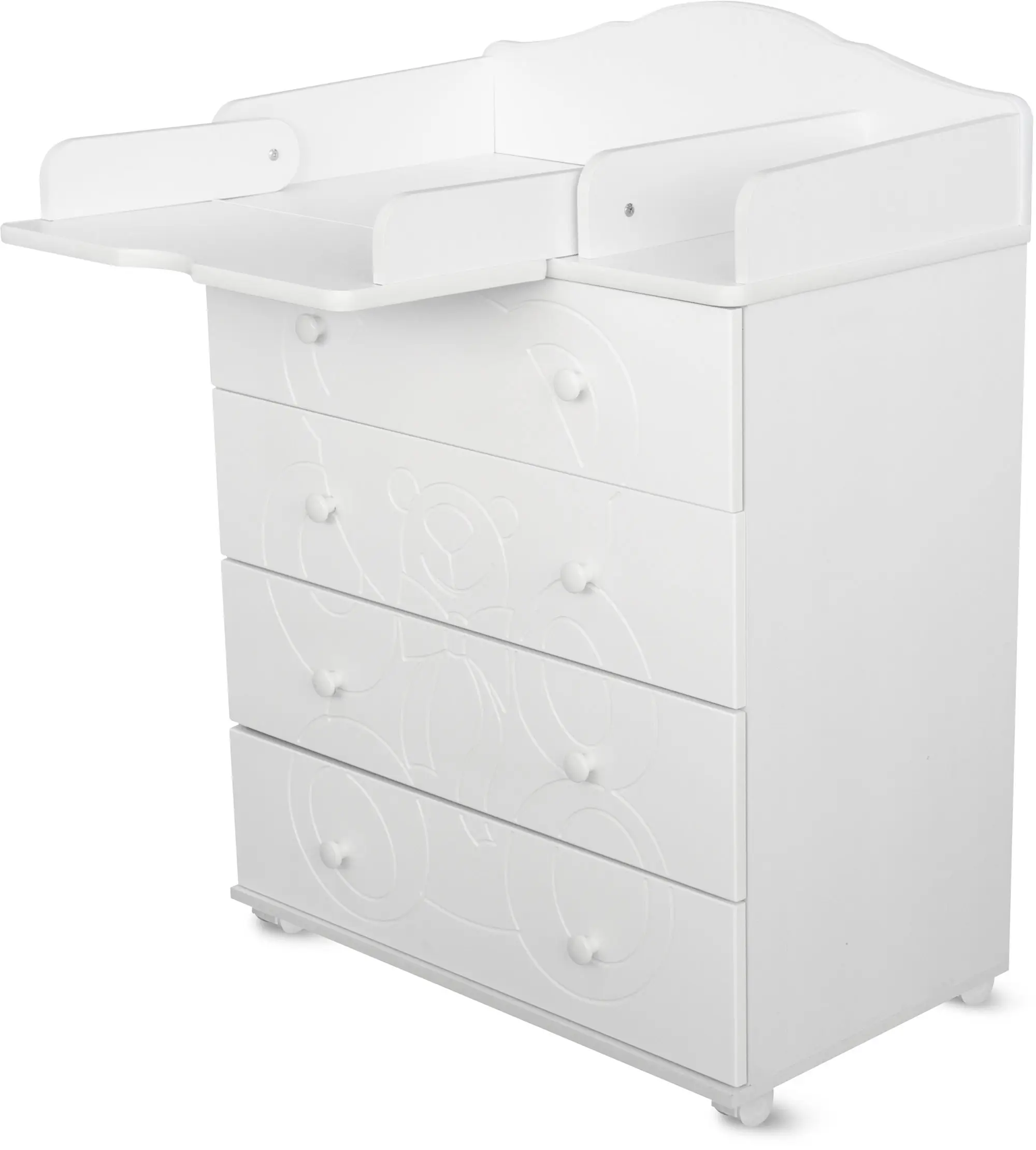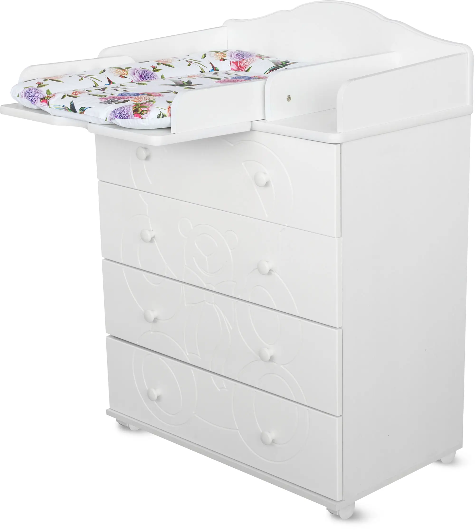 Пеленальный столик с откидной крышкой не только помогает маме в переодевании ребёнка, но при этом экономит пространство в помещении за счёт удобного механизма складывания. Комод имеет 4 больших выдвижных ящика, в которых удобно хранить все необходимые вещи для малыша.