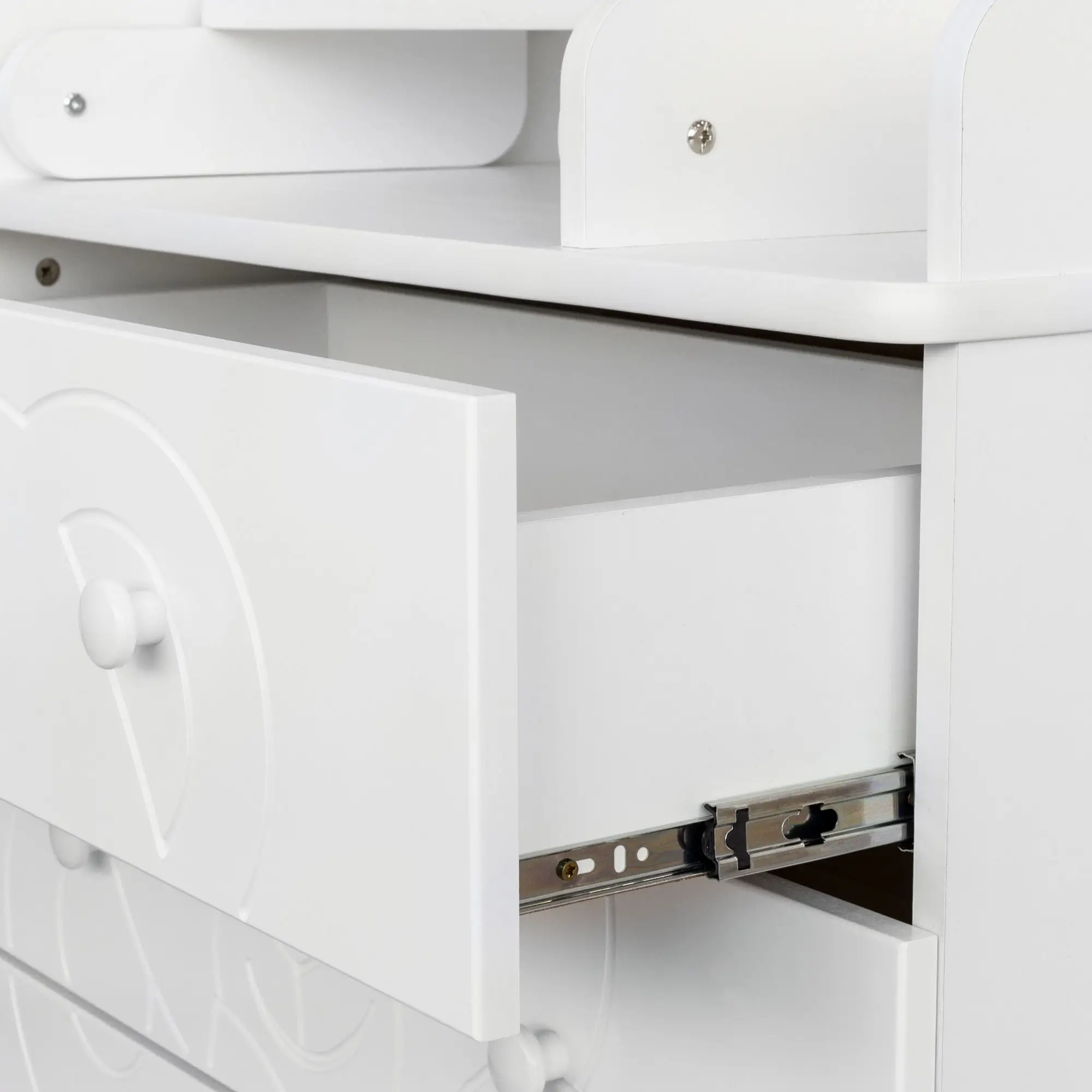 Отсутствуют острые углы – все элементы закруглённые, что делает комод удобным и безопасным для малыша.