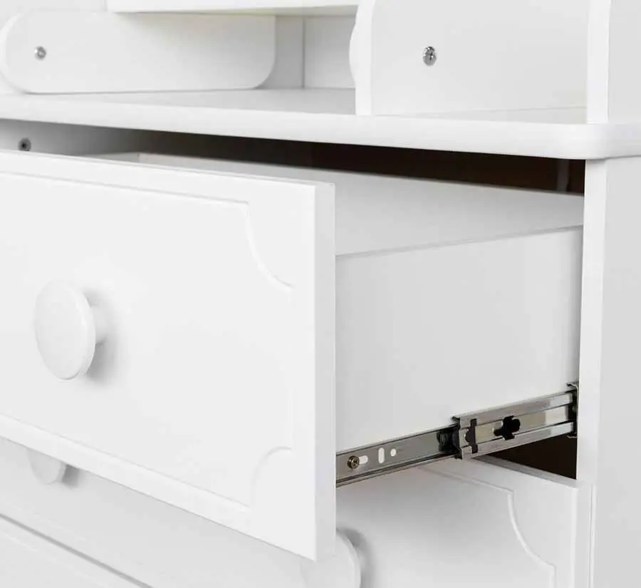 Incanto Richmond – удобный комод с откидной пеленальной доской. Он оснащён 4 выдвижными ящиками с шарикоподшипниковыми направляющими. Фасады комода выполнены из МДФ и украшены красивой накладкой в виде короны. Пеленальный столик можно полностью снять и использовать комод исключительно для хранения вещей. Все края комода закруглены и не имеют острых углов.