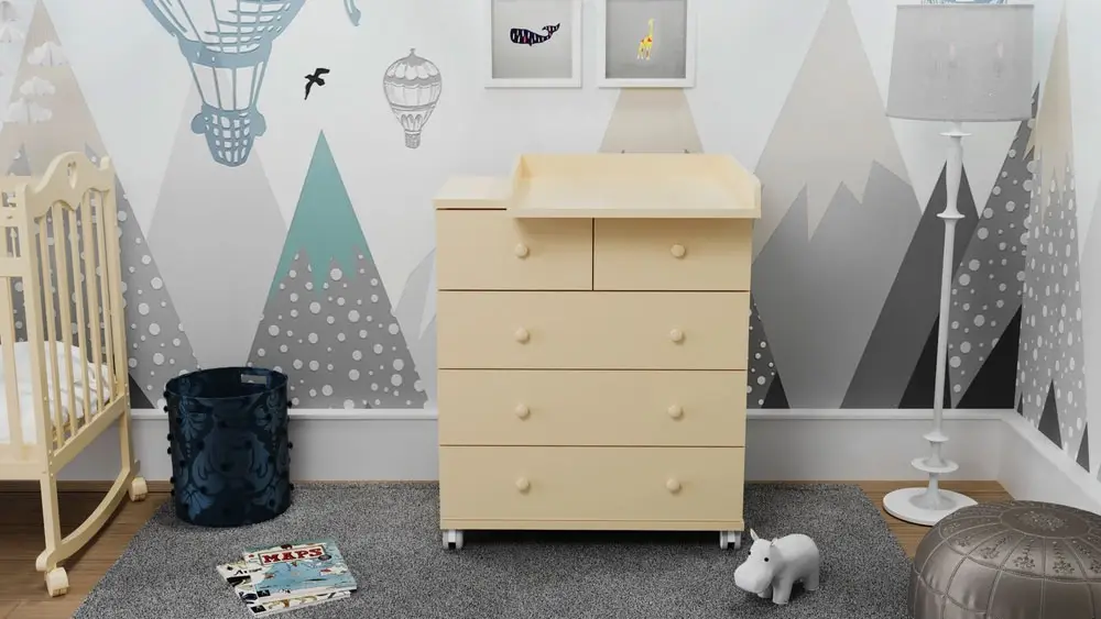 Пеленальная доска с защитными бортиками на комоде съёмная, её легко можно передвигать в любую сторону комода или полностью убрать, когда ребёнок подрастет. Использование комода облегчит родителям уход за ребёнком во время гигиенических процедур.