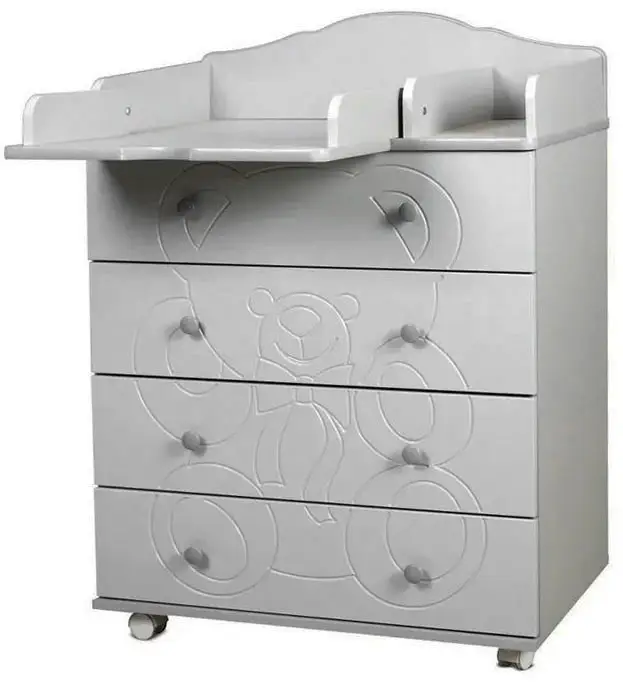 Пеленальный столик с откидной крышкой не только помогает маме в переодевании ребёнка, но при этом экономит пространство в помещении за счёт удобного механизма складывания. Комод имеет 4 больших выдвижных ящика, в которых удобно хранить все необходимые вещи для малыша.