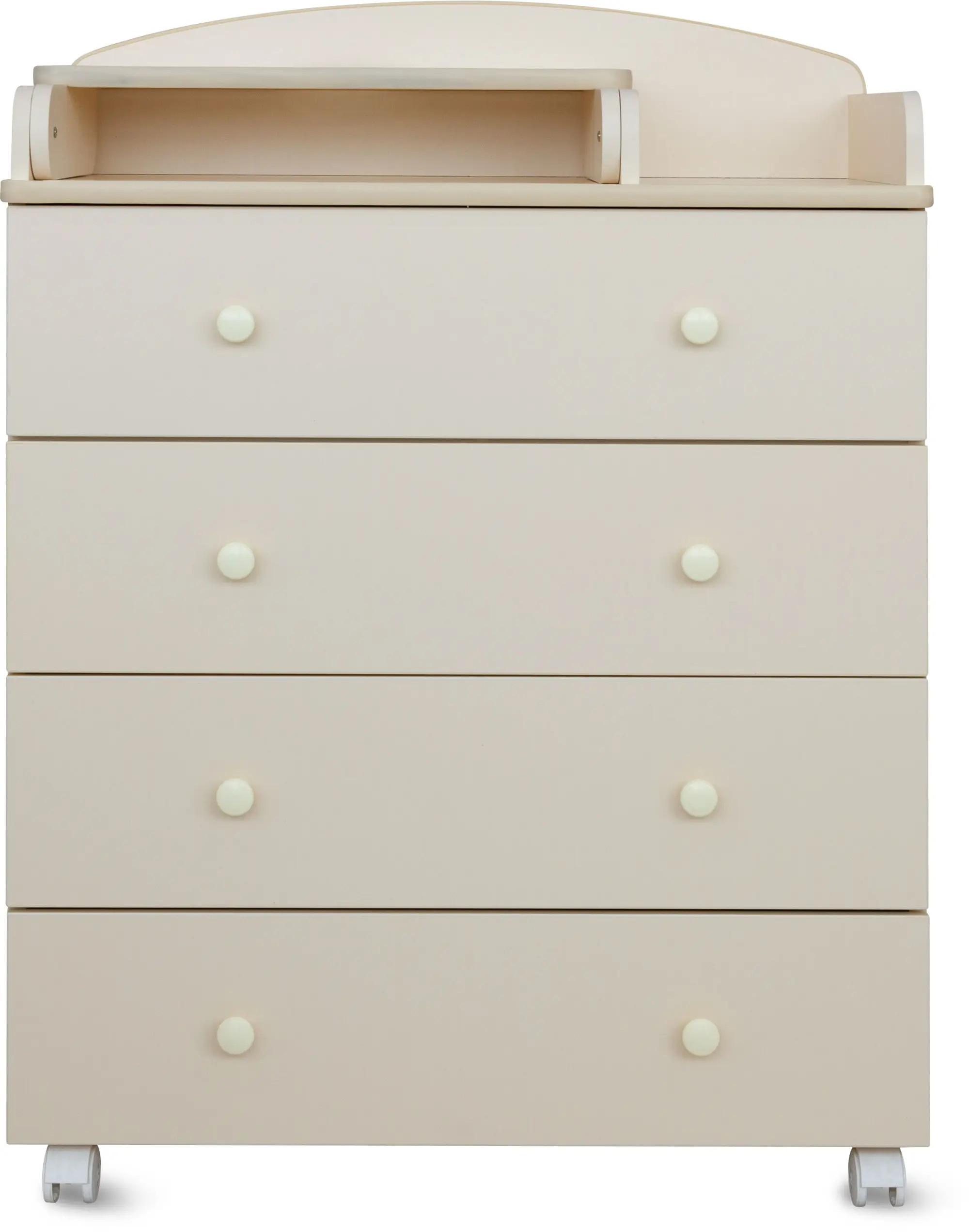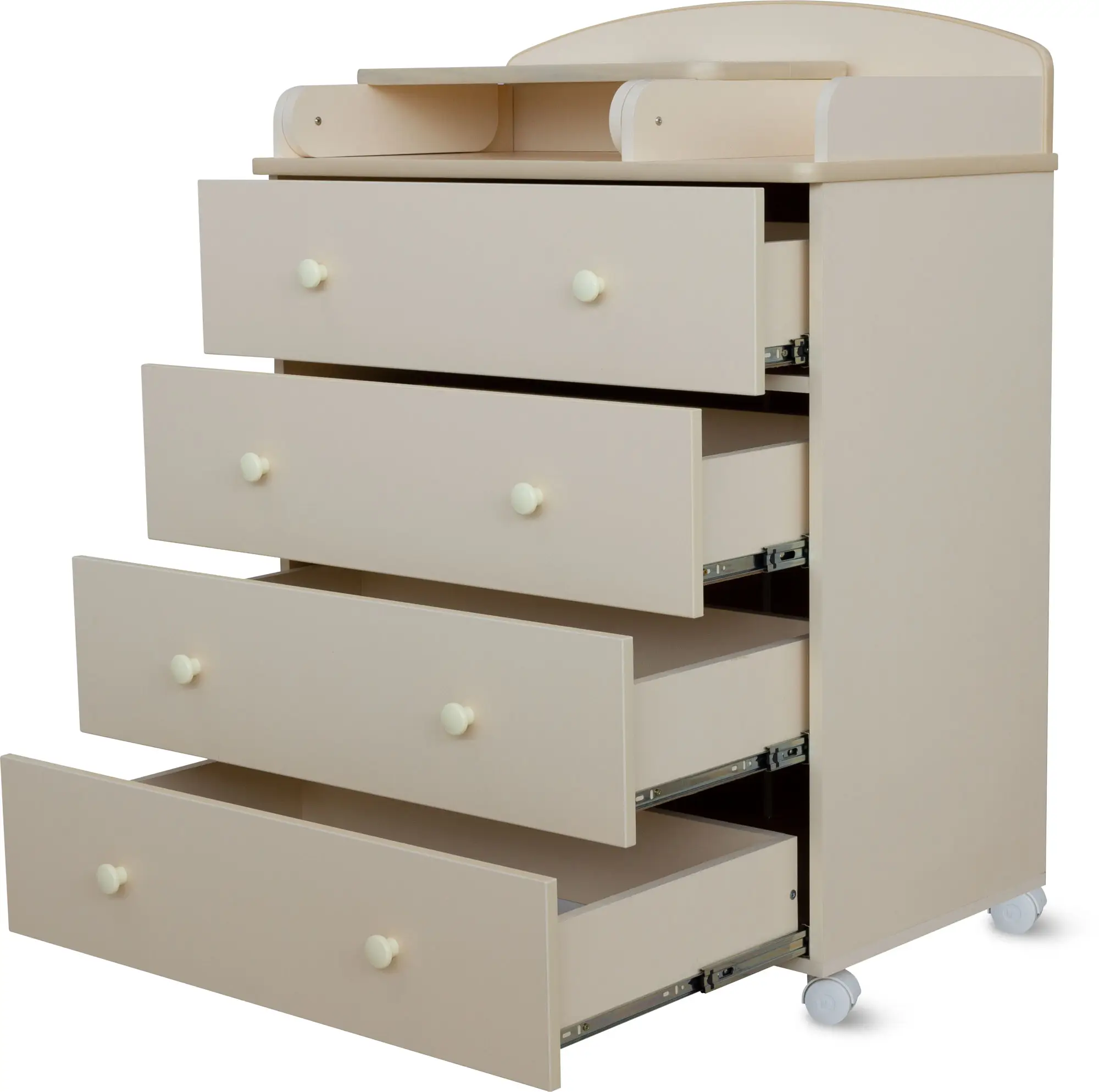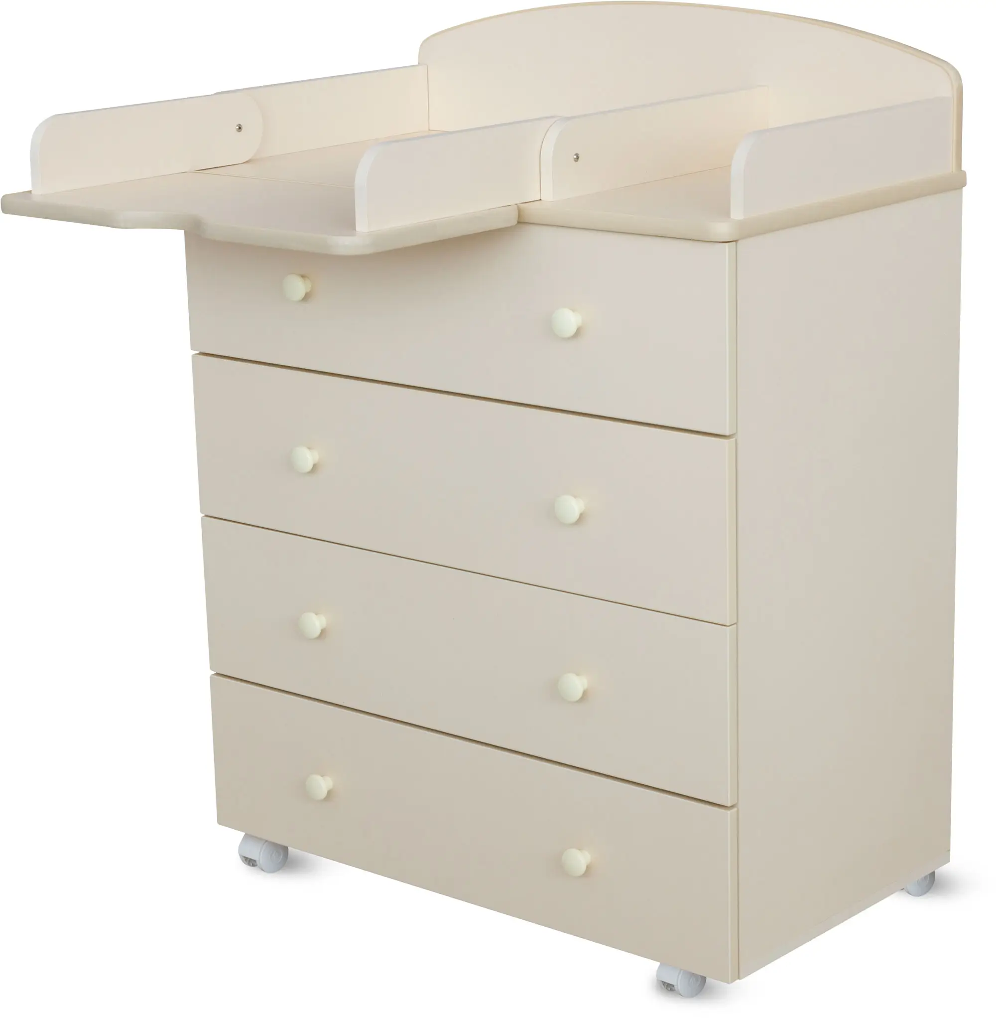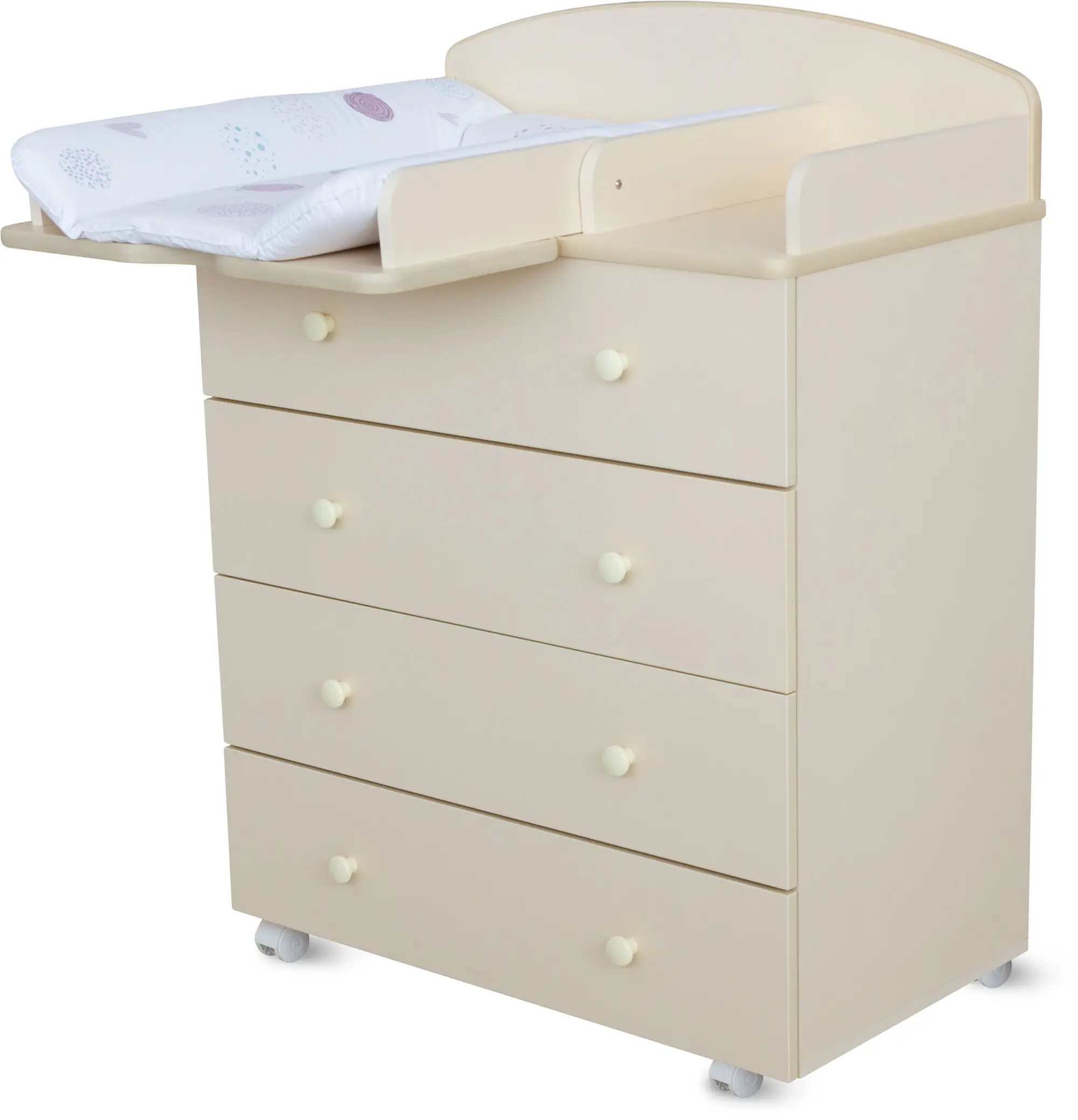 Пеленальный столик с откидной крышкой не только помогает маме в переодевании ребёнка, но при этом экономит пространство в помещении за счёт удобного механизма складывания. Комод имеет 4 больших выдвижных ящика, в которых удобно хранить все необходимые вещи для малыша.