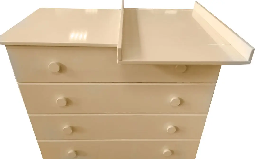 Комод Няня отличается компактными габаритами. Комод можно использовать как пеленальный столик – верхняя полочка откидывается, превращаясь в полноценную пеленальную поверхность. Таким образом комод можно использовать как обычный предмет мебели.