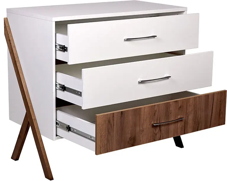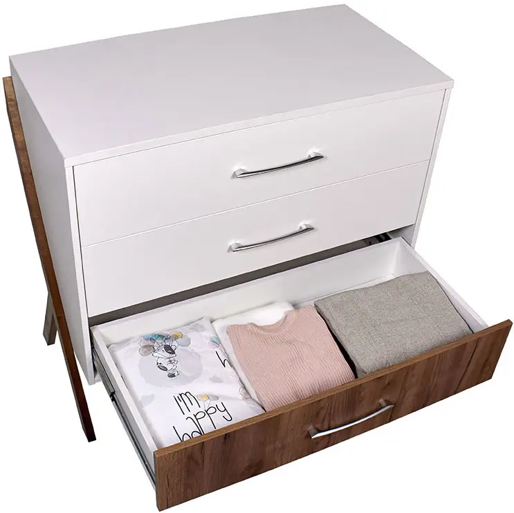 3 глубоких ящика для детских принадлежностей выдвигаются легко и бесшумно, оснащены удобными мебельными ручками. Ящики на шариковых направляющих.