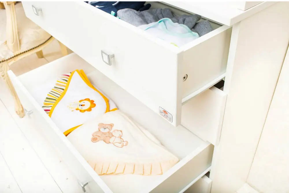 Отсутствуют острые углы – все элементы закруглённые, что делает комод удобным и безопасным для малыша.