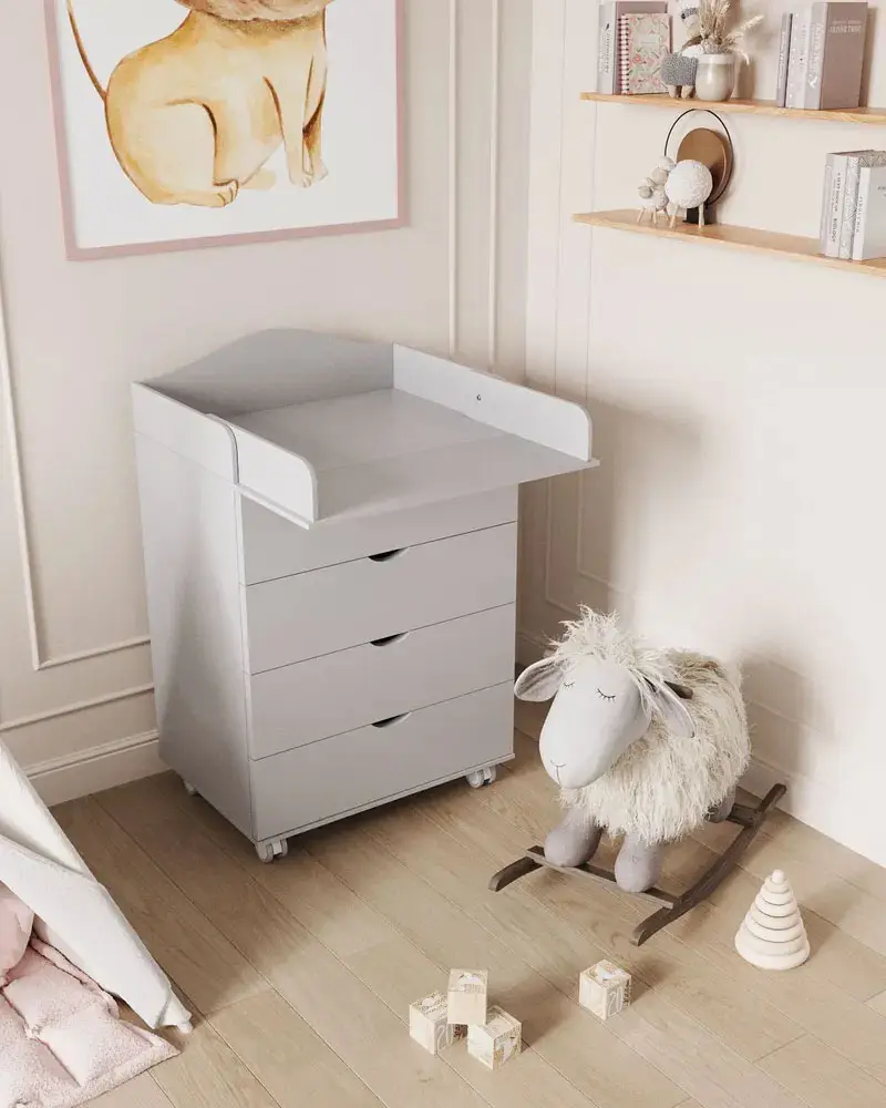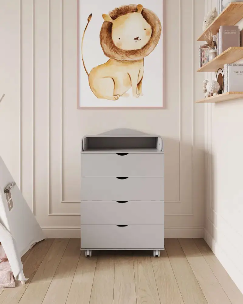 4 глубоких ящика для детских принадлежностей выдвигаются легко и бесшумно. Ящики на роликовых подшипниках.