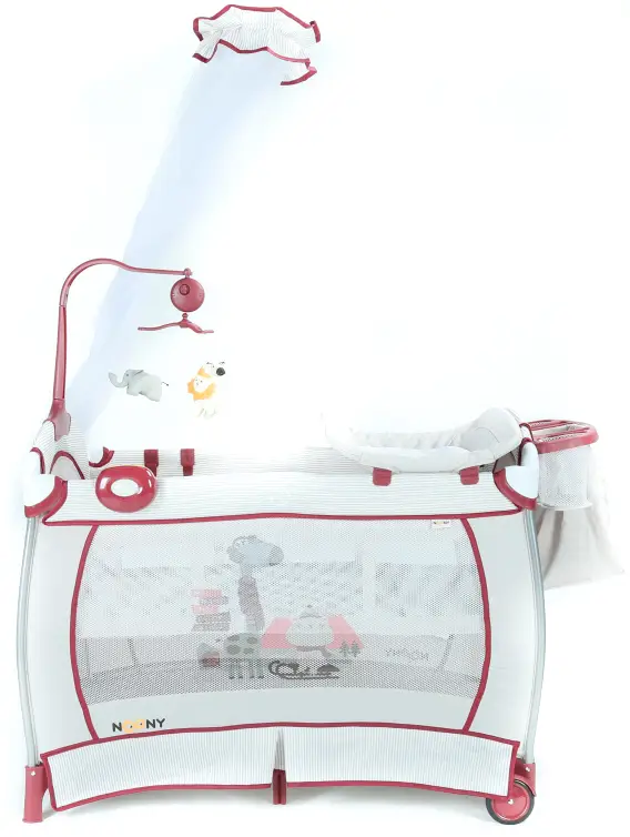 Детский манеж Noony Friends комплектуется музыкальным блоком, коробкой для подгузников, сумкой для переноски.