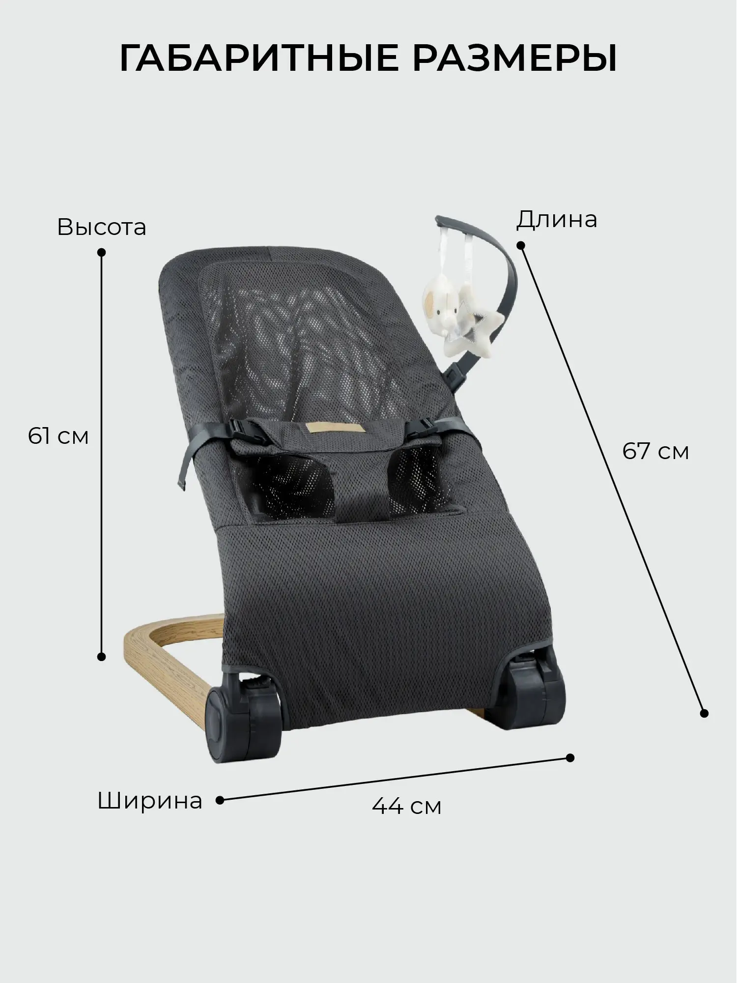 - у шезлонга имеется дуга с двумя шуршащими игрушками, что позволяет развивать моторику ребёнка;