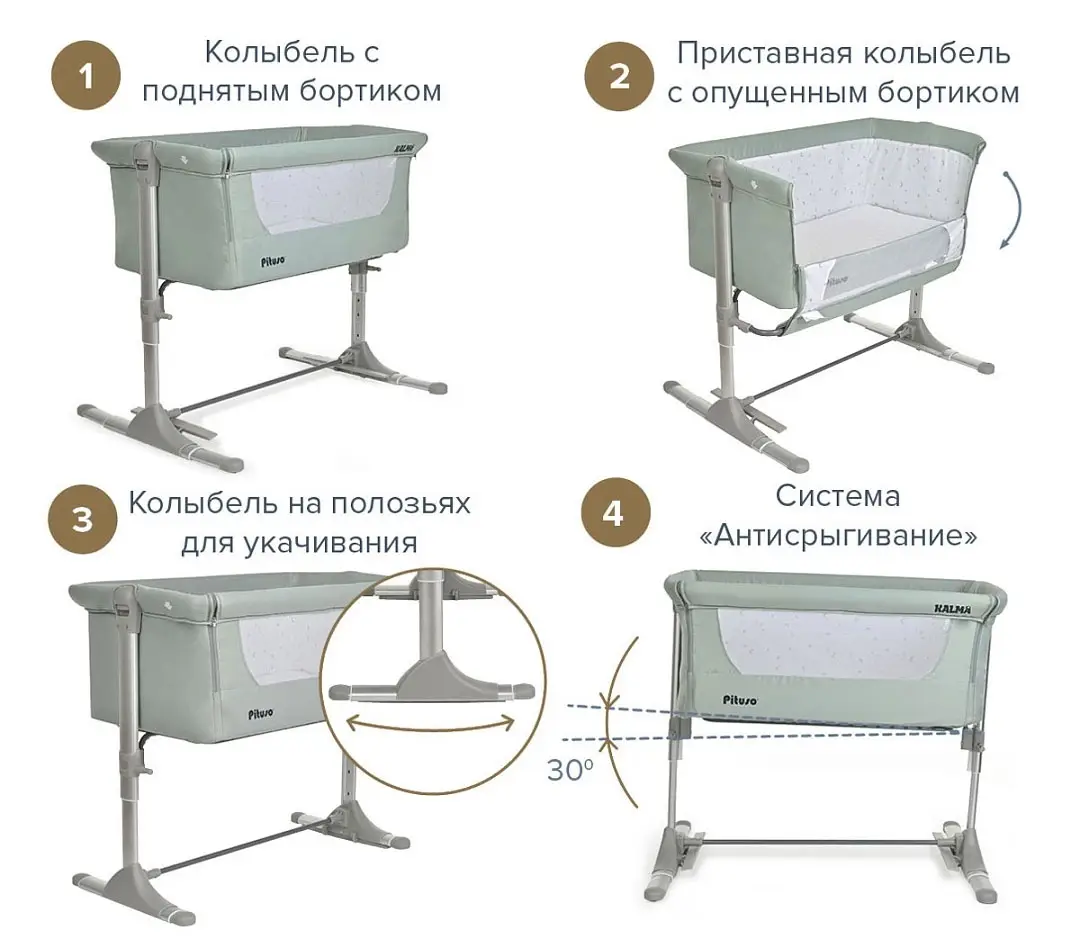 Полозья превращают изделие в колыбель с помощью специального маятника для укачивания. Также мама может приподнять изголовье ложа, что улучшит дыхание малыша во время простудных заболеваний и снизит риск срыгивания после кормления. Регулируемая высота опор даёт возможность создать наклон до 30°. Колыбель Pituso Kalma оснащена специальной системой крепления, благодаря которой фиксировать её к кровати родителей очень просто. Крепится к кровати родителей с помощью ремней.