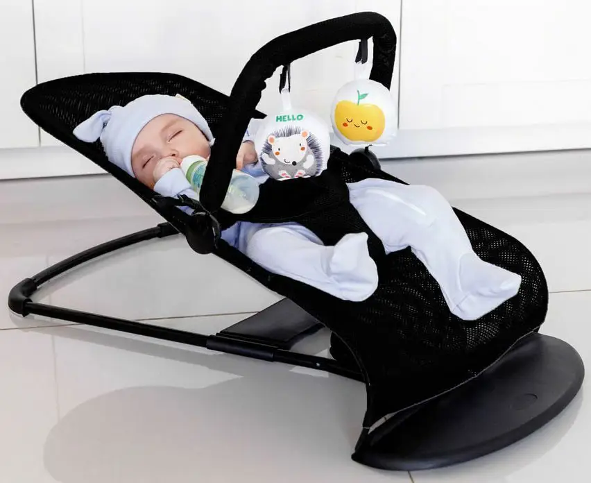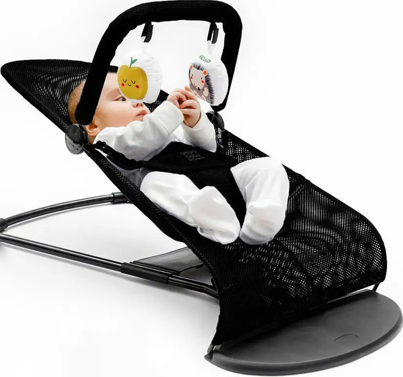 Благодаря сетчатому материалу из полиуретана шезлонга-качалки, ребенок находится в естественной и комфортной позе, сетка обеспечивает хорошую поддержку для тела малыша. Своими движениями ребенок будет раскачивать шезлонг и успокаиваться, родителям не придется долго укачивать ребенка на своих руках. 4 положения наклона спинки позволят использовать кресло шезлонг как можно дольше: с ростом ребенка вы просто переводите регулятор на положение выше. А если шезлонг сейчас не нужен, то его можно сложить и убрать за диван, ведь в таком виде он занимает совсем мало места. Не переживайте за безопасность вашего ребенка, надежные застежки удержат самого шаловливого малыша в детском кресле, а противоскользящие насадки не позволят перевернуться на пол. В комплекте с шезлонгом для новорожденных идет дуга с игрушками. Они привлекут внимание ребенка и будут развлекать долгое время, а если надоест, вы можете просто повесить свои. Когда малыш подрастет, шезлонг можно использовать как стульчик для кормления. Даже если пюре окажется не там, где надо, вы можете легко снять чехол и постирать. Чехол-сетка быстро высыхает и через пару часов вы можете снова использовать любимое кресло.