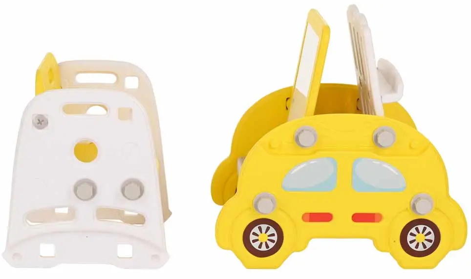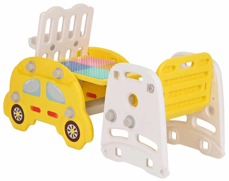 Конструкция любого собранного предмета прочная, не скользкая и не имеет острых углов. Стол имеет двухстороннюю столешницу для рисования маркером или фломастерами, а также игры с конструктором. В набор входят детали конструктора – 62 штуки. В стеллаже есть 2 полочки, а горка отличается широким основанием и устойчивостью.
