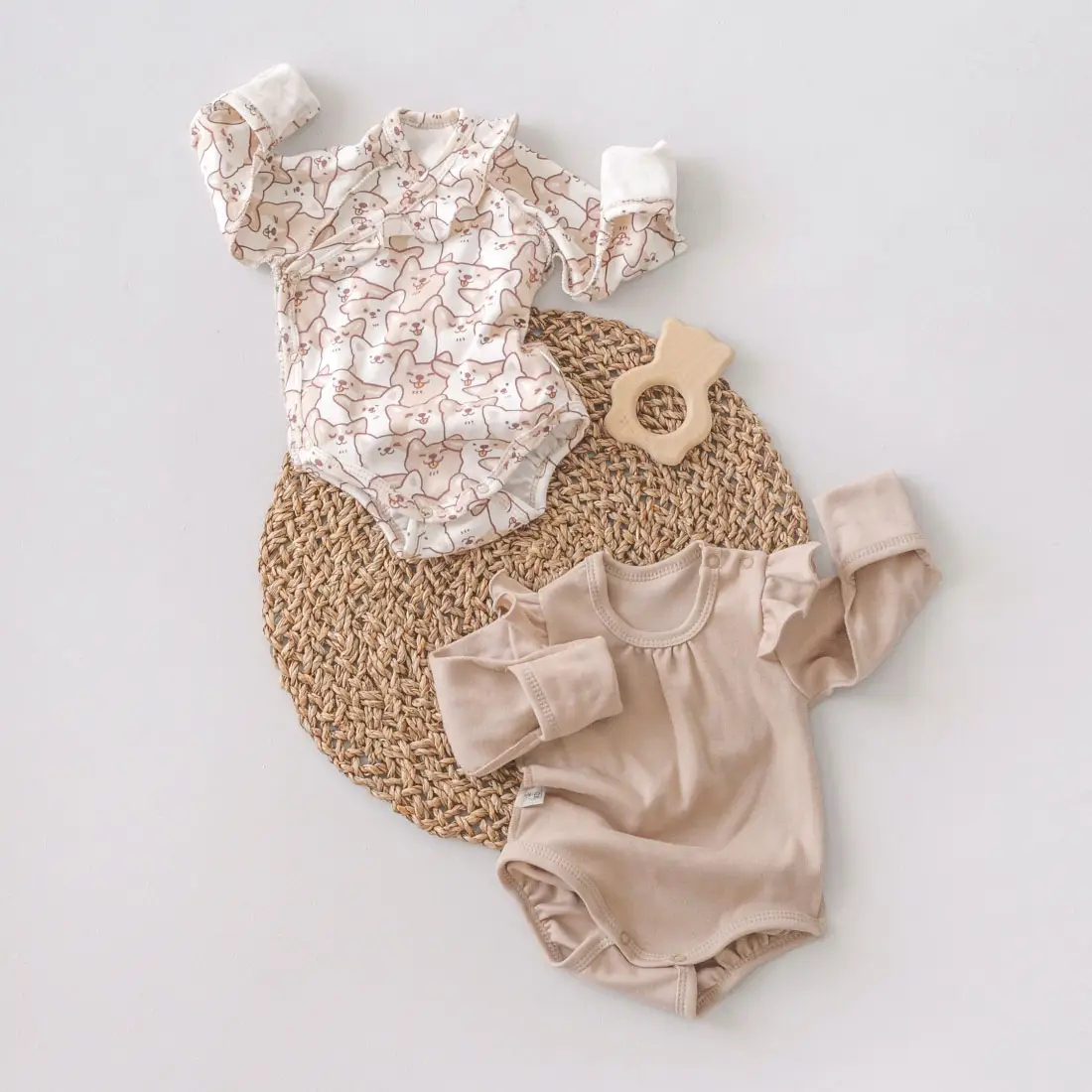 Одно боди имеет застёжку на плече и крылышки на плечах. Второе – с запахом, с кнопочками наискосок. Рукав от линии ворота исключает натирани...