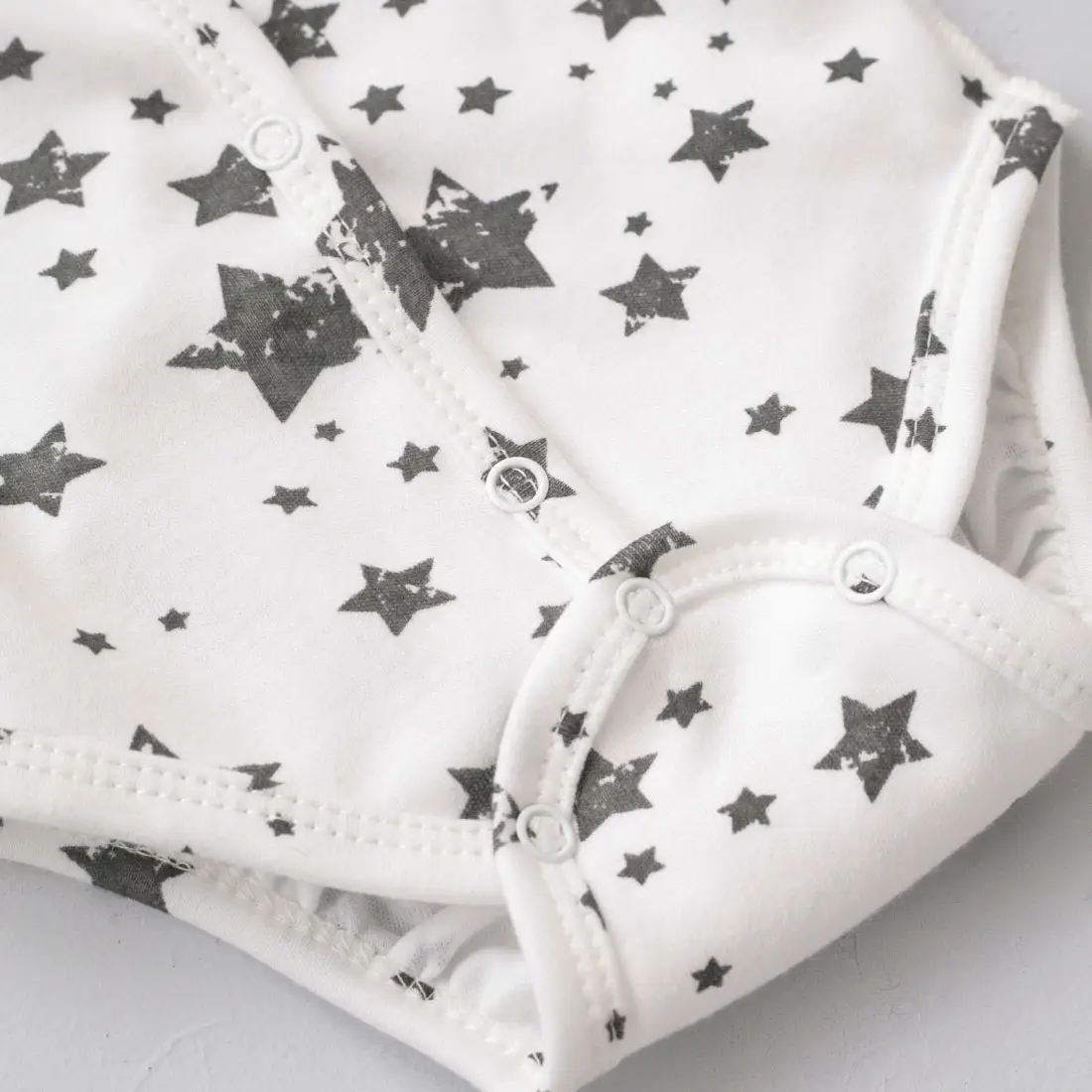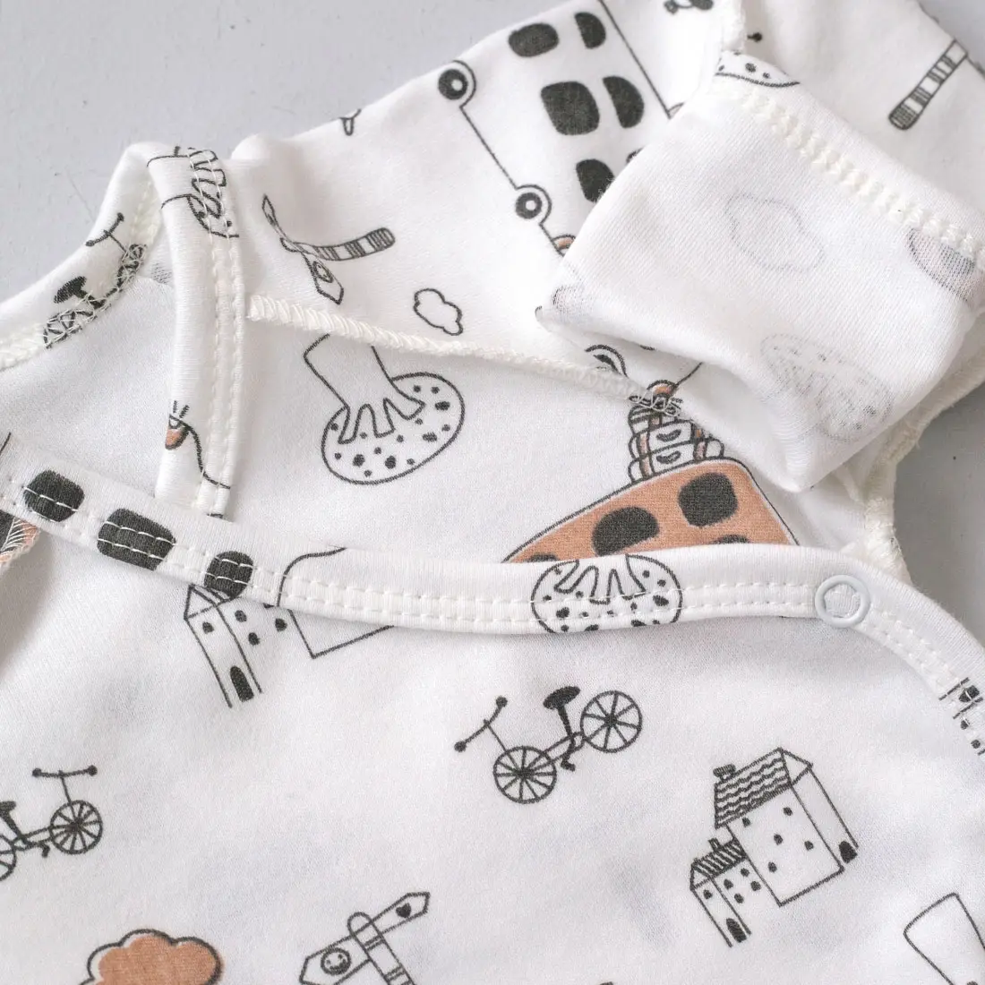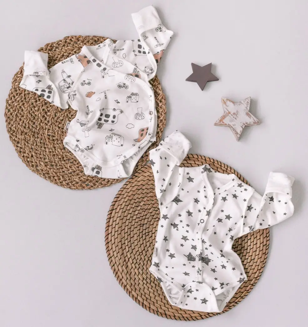 Боди с запахом, с кнопочками наискосок. Рукав от линии ворота исключает натирание в проблемной плечевой-подмышечной зоне младенца. Запах на груди исключает давление кнопок при лежании на животике. Изготовлен из натурального хлопка – в нём малышу будет тепло и комфортно.
