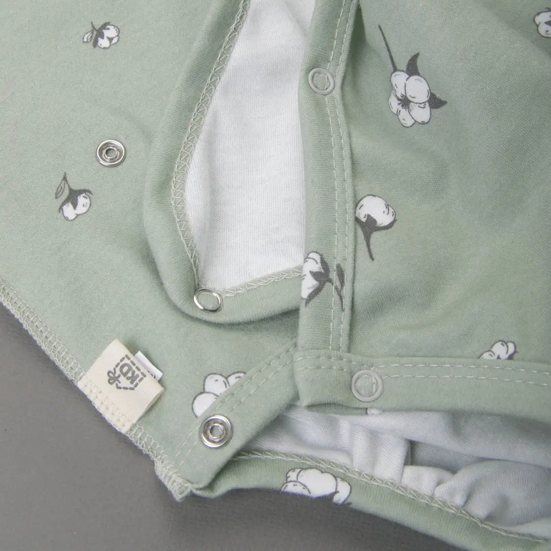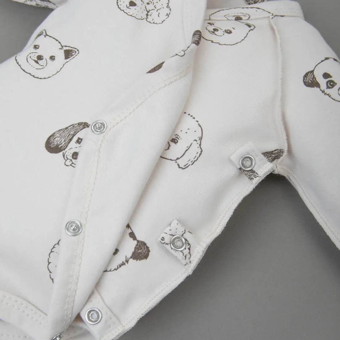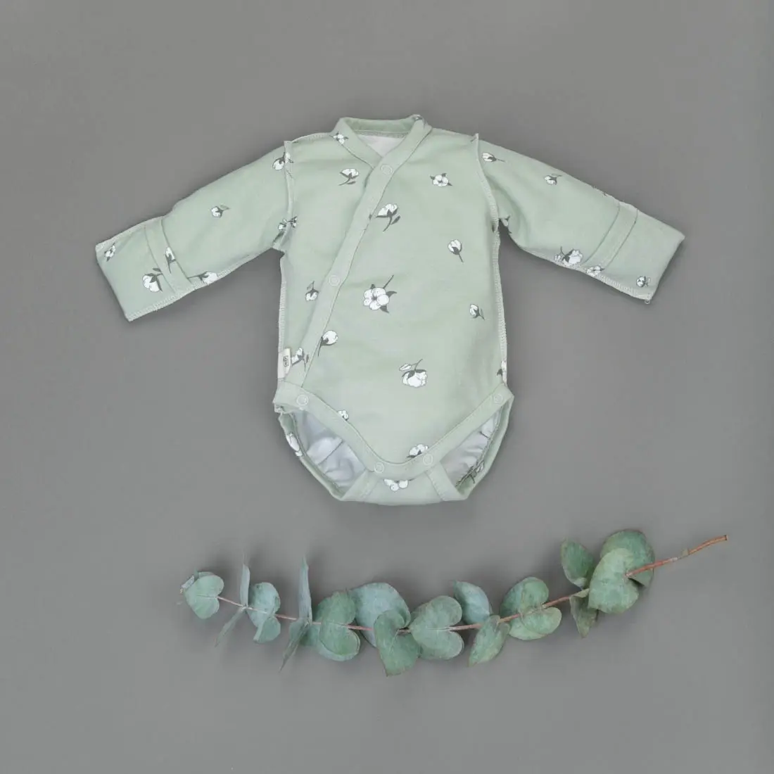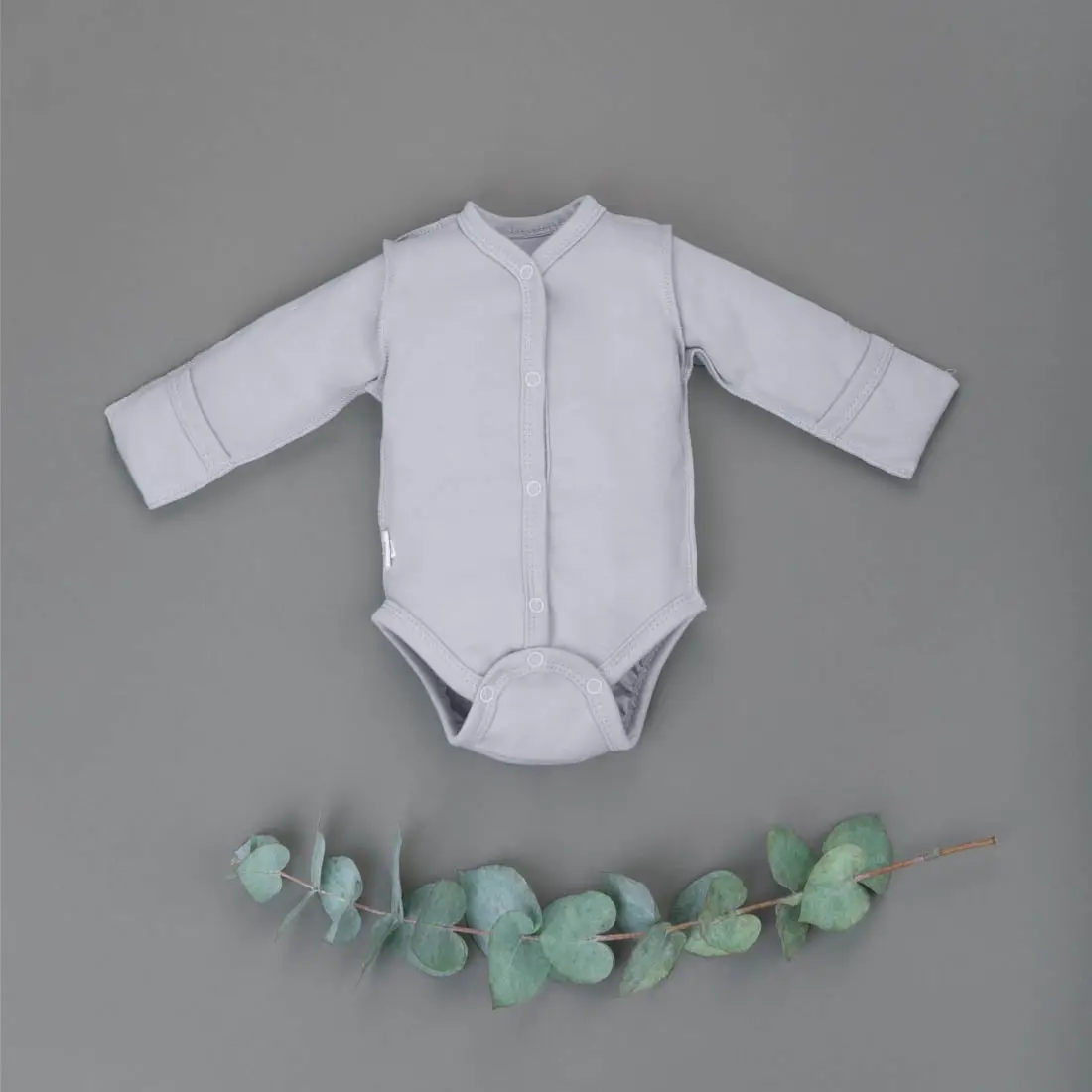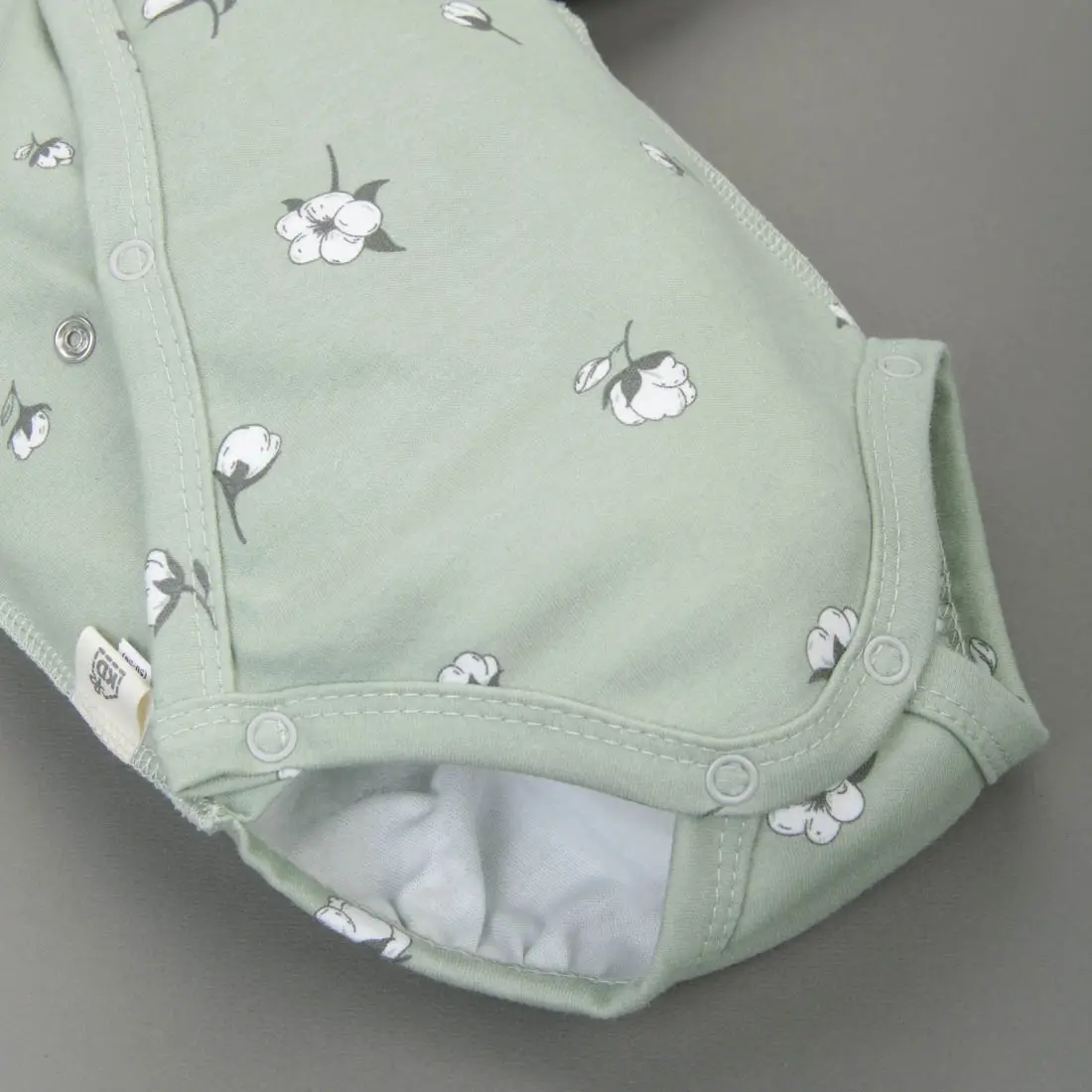 Первое боди оснащено симметричной застёжкой на кнопки и запахом, что обеспечивает удобство и комфорт при использовании. Рукав начинается от линии ворота, предотвращая натирание в проблемной плечевой и подмышечной зонах младенца.