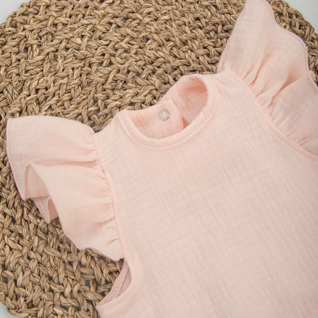 Летний боди с крылышками вместо рукавов – идеальный выбор для малышей. Застёгивается на одну кнопку по спинке и три кнопки снизу для удобной смены подгузника. Изготовлен из мягкого и приятного на ощупь муслина, состоящего из 100 % хлопка. Этот материал обеспечивает комфорт и хорошую вентиляцию в жаркие дни.
