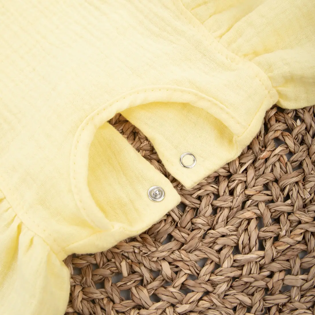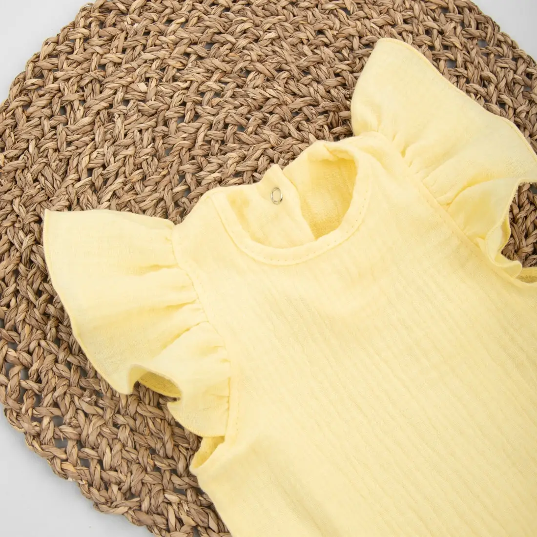 Летний боди с крылышками вместо рукавов – идеальный выбор для малышей. Застёгивается на одну кнопку по спинке и три кнопки снизу для удобной смены подгузника. Изготовлен из мягкого и приятного на ощупь муслина, состоящего из 100 % хлопка. Этот материал обеспечивает комфорт и хорошую вентиляцию в жаркие дни.
