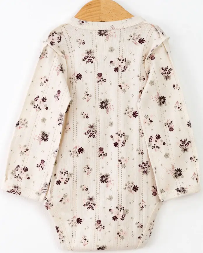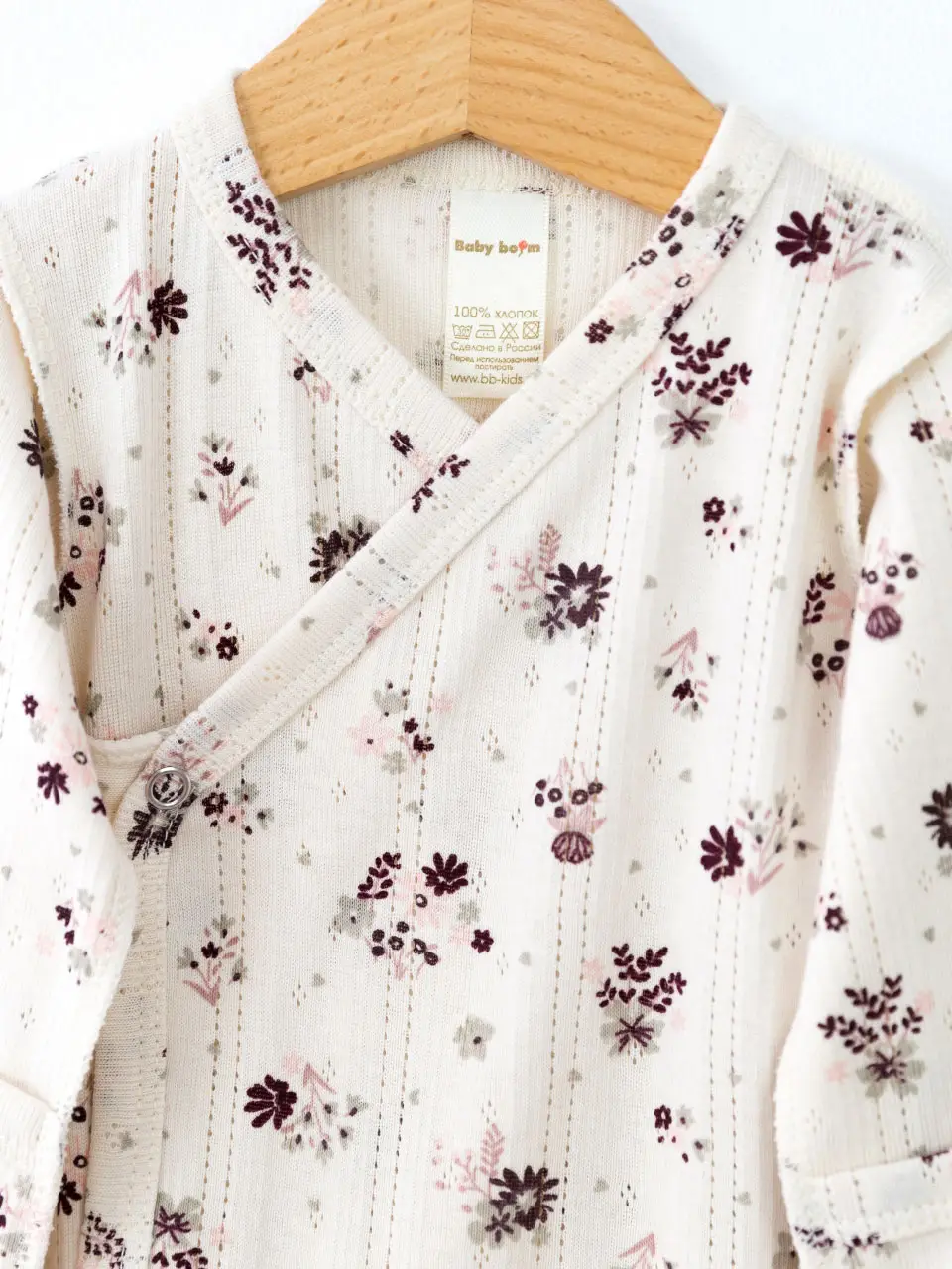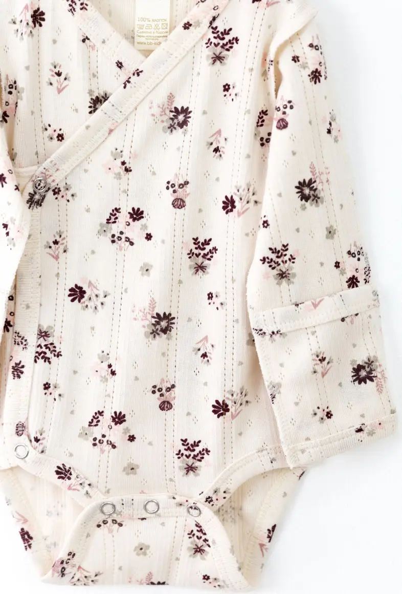 Боди с запахом для новорождённых выполнен из нежной ажурной рибаны с изысканным принтом, 100% хлопок.