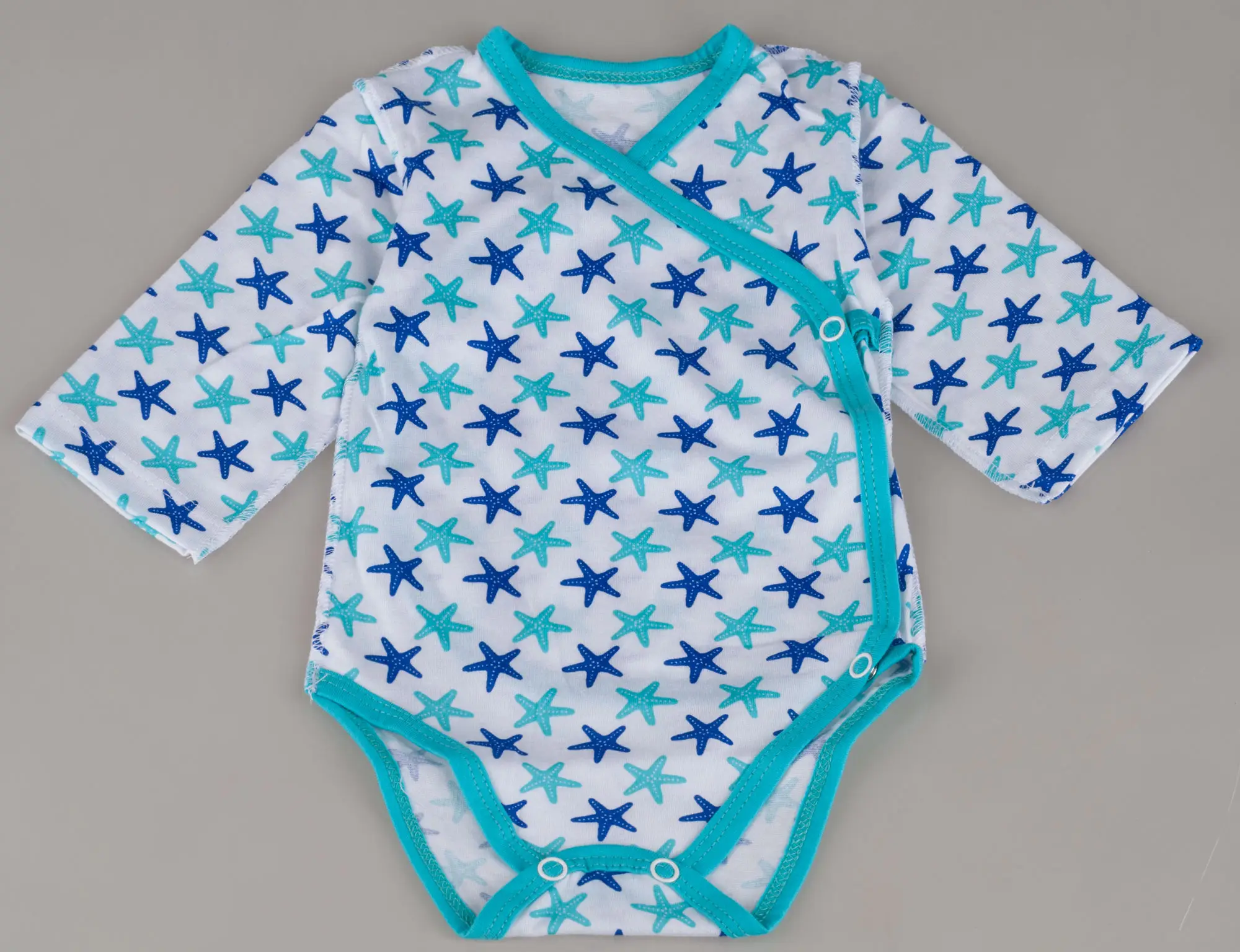 Простой, но очень симпатичный боди на запахе от бренда Фабрика Бамбук сделан из мягкой хлопковой ткани и приятен нежной коже ребёнка.