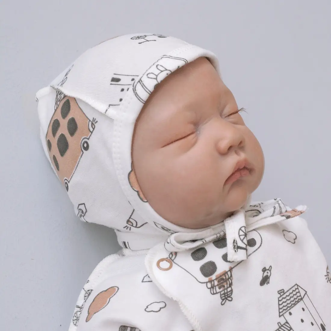 Чепчик НKiDi отлично прикрывает ушки и хорошо держится на головке малыша.