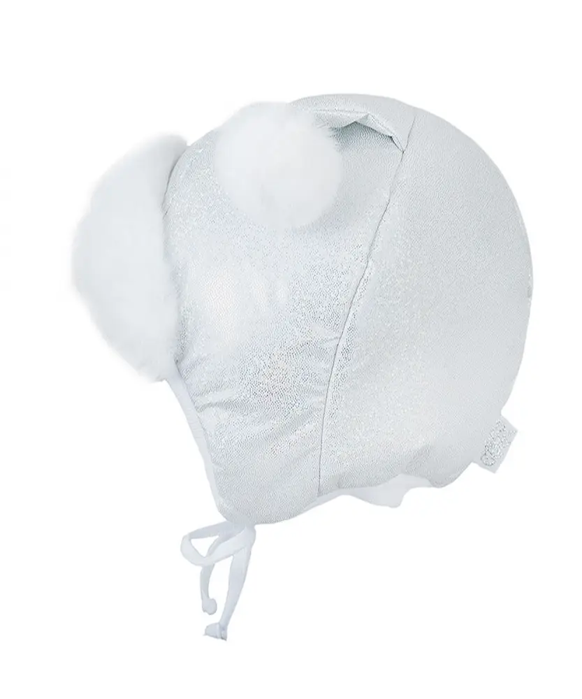 Шапка меет 3 защитных слоя – верх из плащёвой ткани с водоотталкивающей пропиткой. Утеплитель – прокладка из двухслойного синтепона. Подкладка – хлопчатобумажное трикотажное полотно. Декорирована двумя меховыми помпонами.