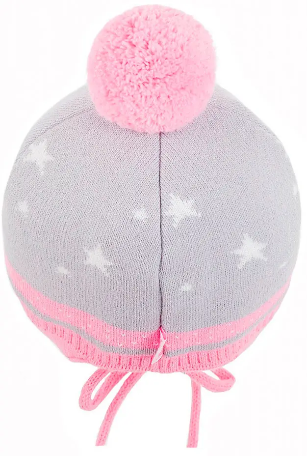 Шапка с отворотом, с ушками, на завязках выполнена из акрилового вязаного полотна, на подкладке из хлопка и забавным помпоном.