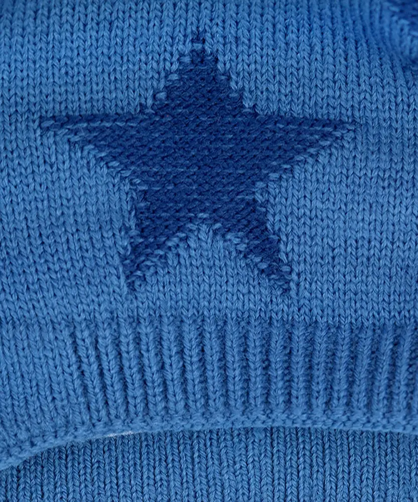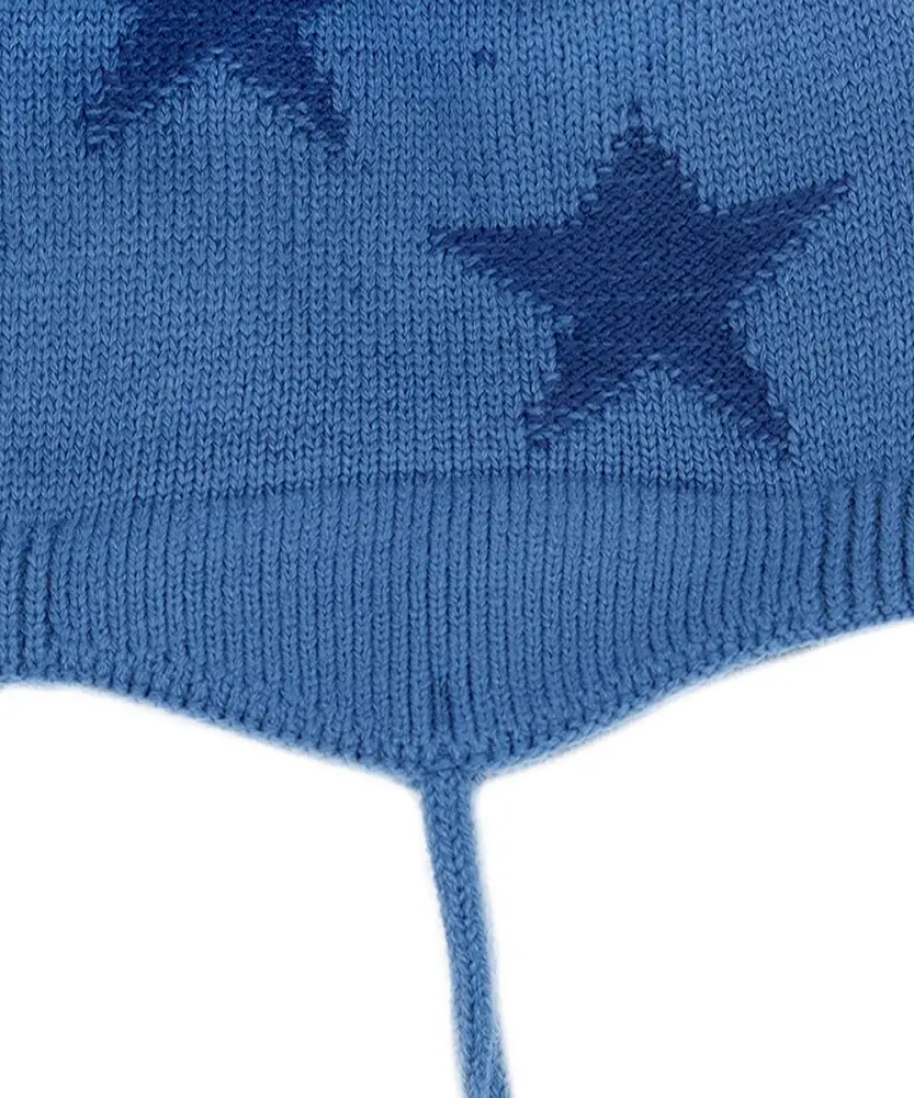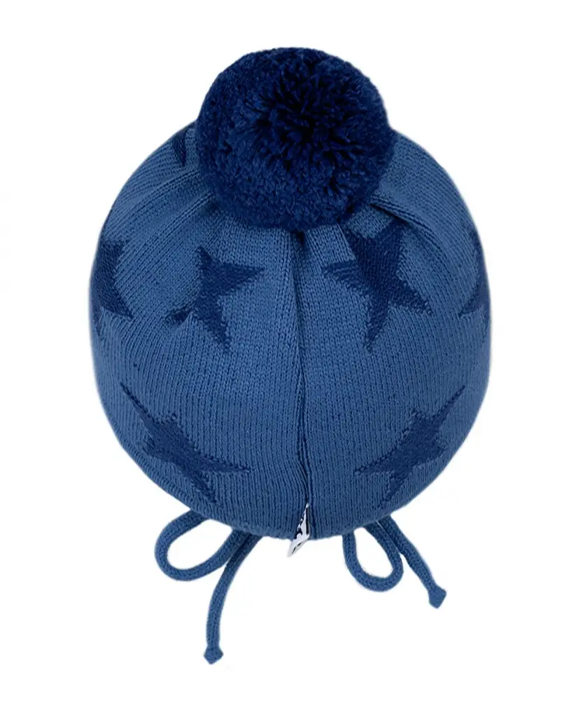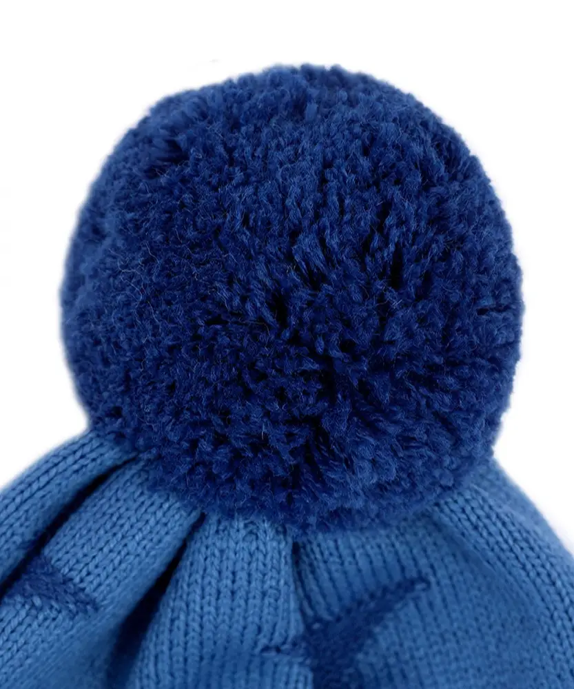 Шапка с отворотом, с ушками, на завязках выполнена из акрилового вязаного полотна, на подкладке из хлопка, с нитяным помпоном.