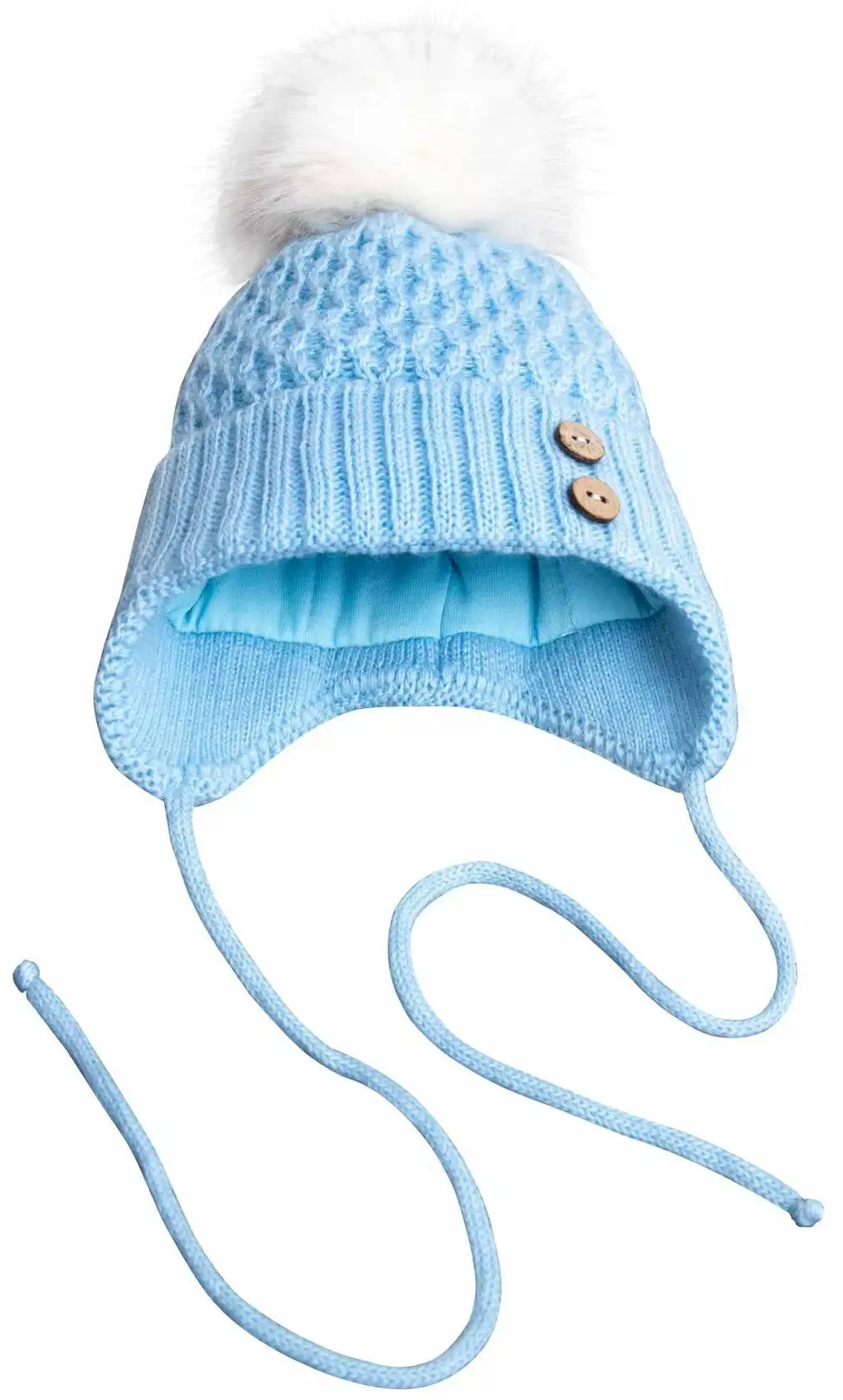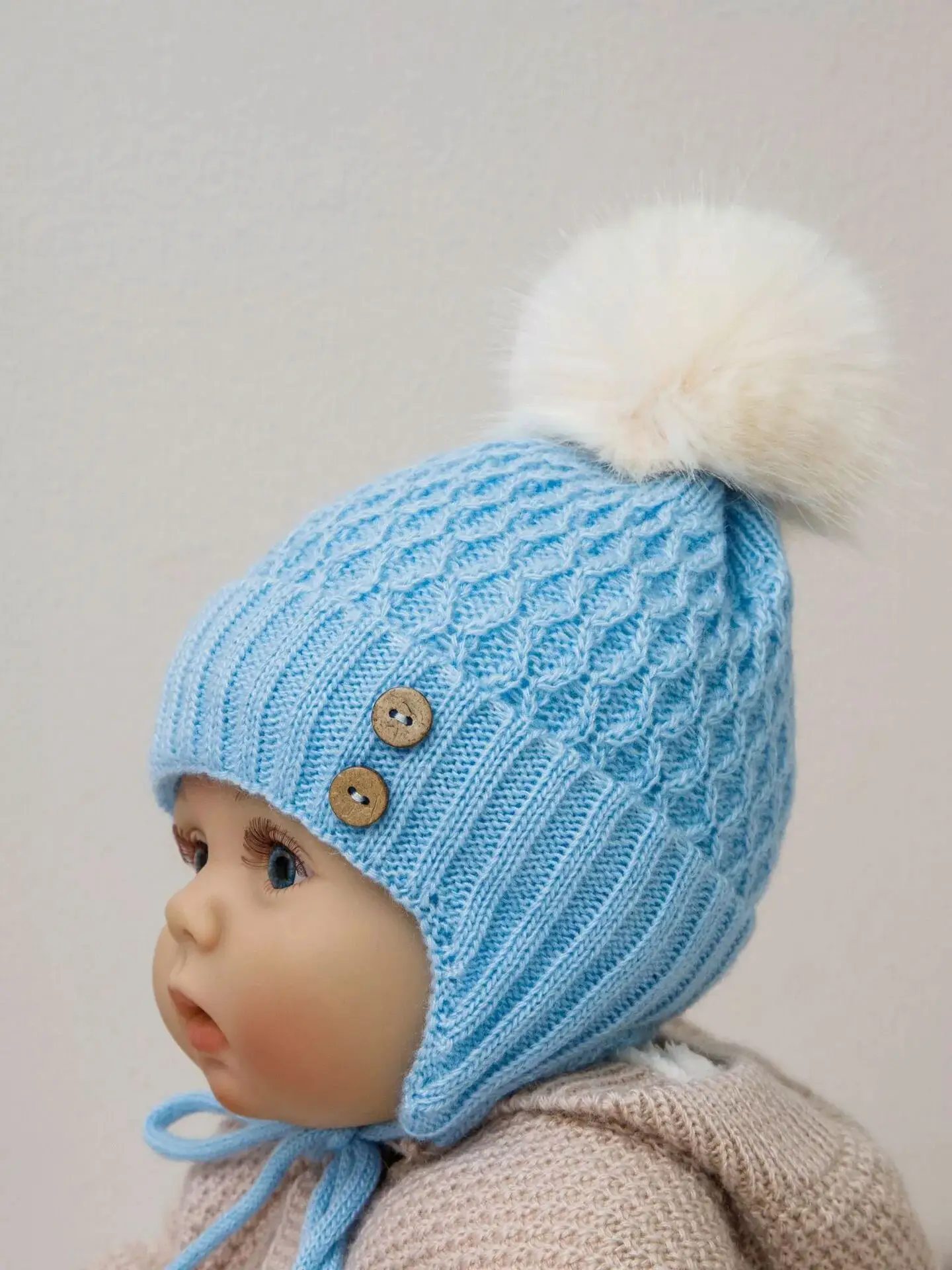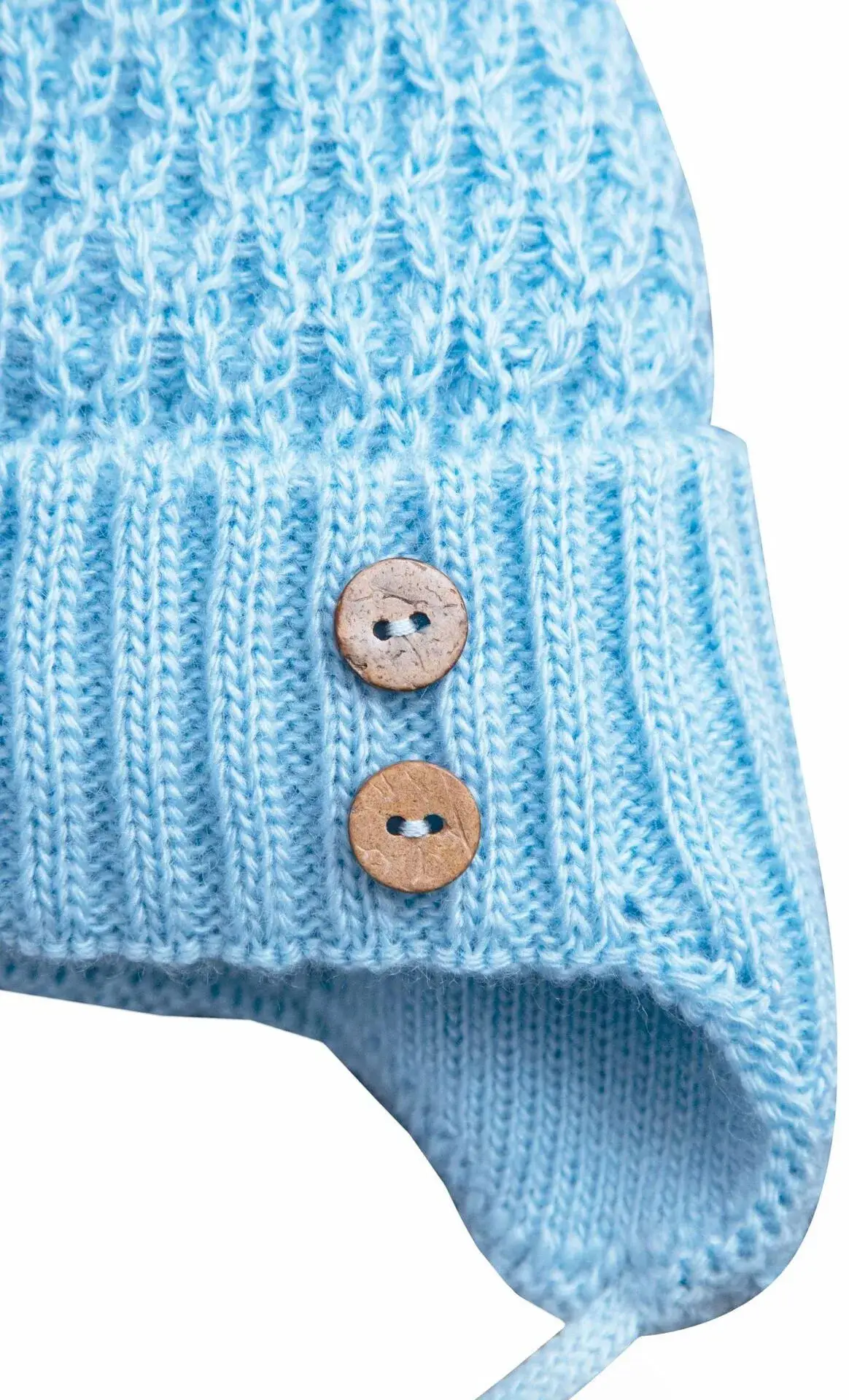 - пушистый помпон нарядного белого цвета и оригинальные пуговички из 100% кокосовой скорлупы украшают детскую шапочку.