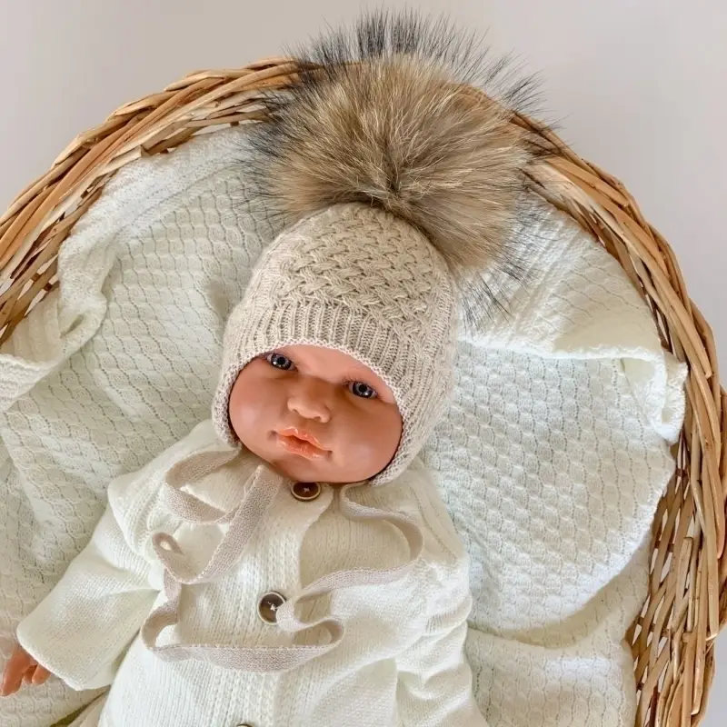 Шапочка двойная вязка Little Star Альба бумбон - мех енота бежевый меланж 36-38