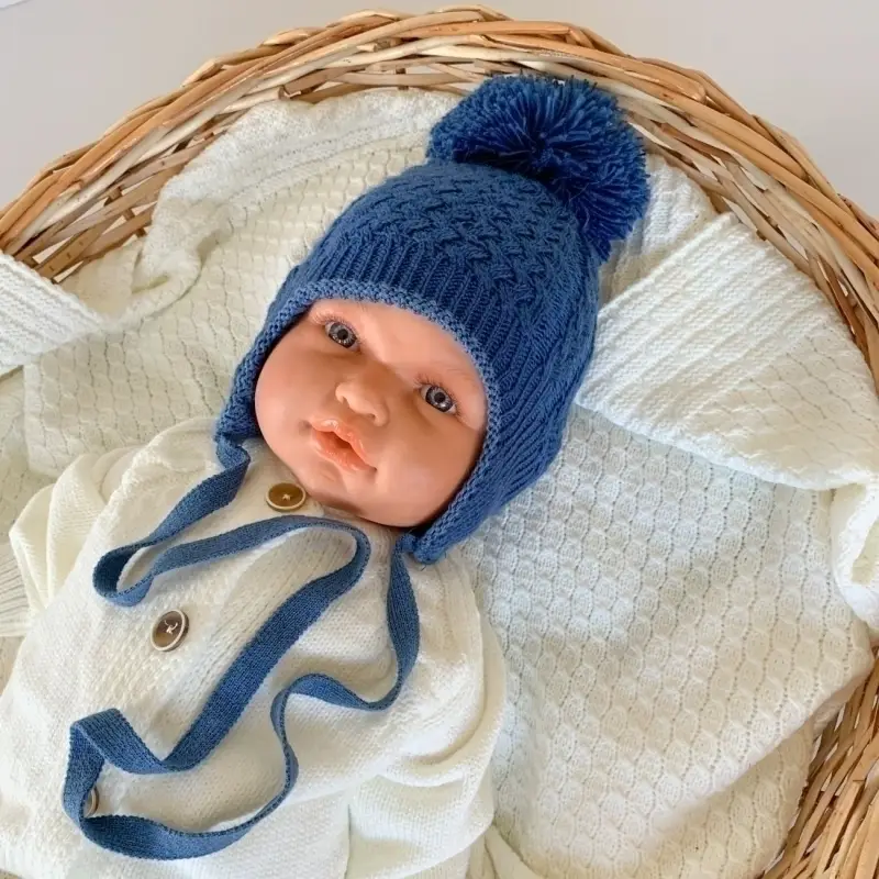 Шапочка двойная вязка Little Star Альба бумбон вязаный синий меланж 40-42