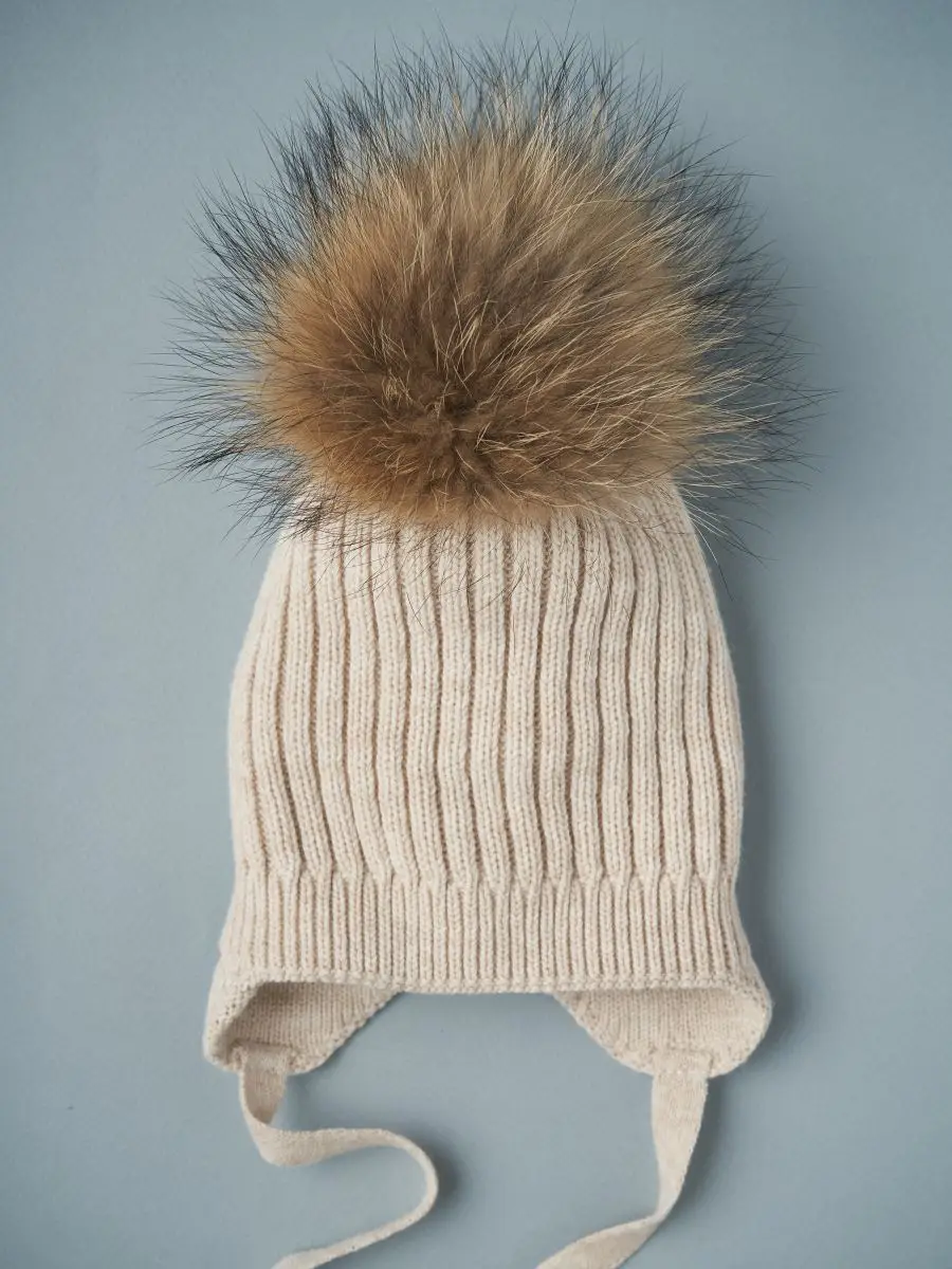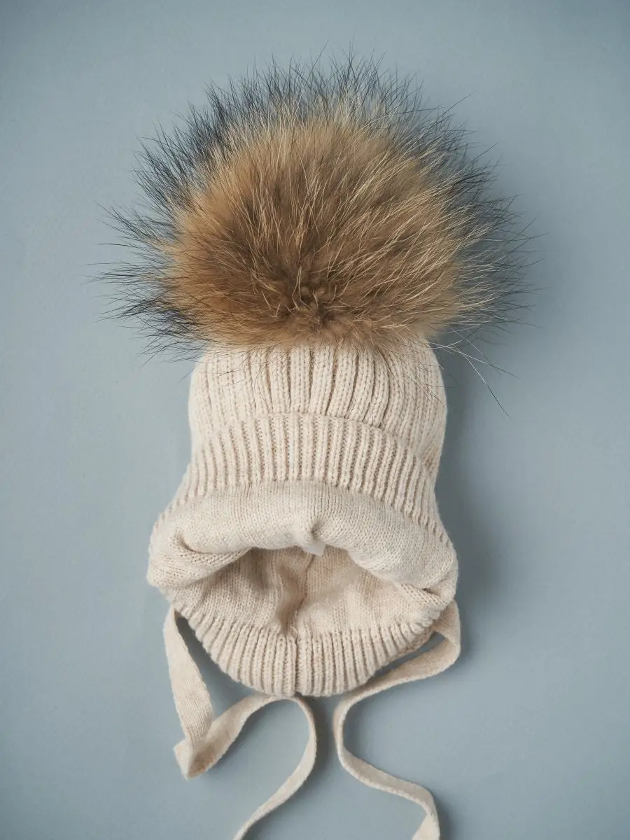 Зимняя шапочка с натуральным бумбоном выполнена из двухслойной вязки, отлично прилегает по головке малыша, закрывает ушки, лобик и прекрасно защищает от холода.