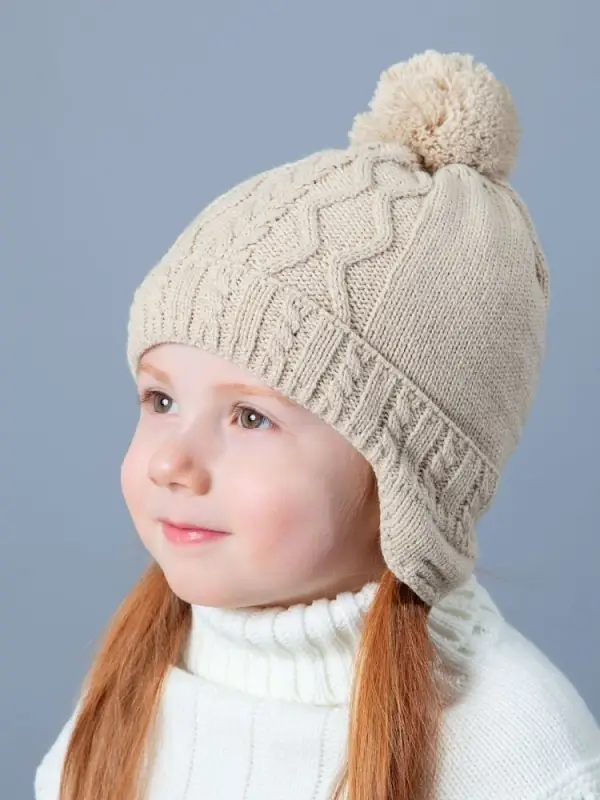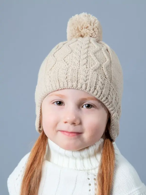 Зимняя шапочка с бумбоном выполнена из двухслойной вязки, отлично прилегает по головке малыша, закрывает ушки, лобик и прекрасно защищает от холода.