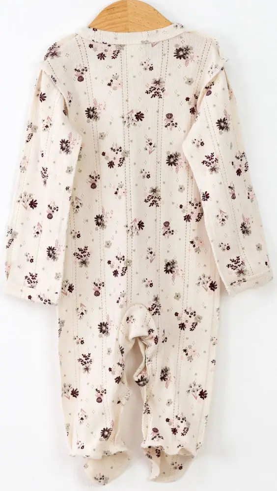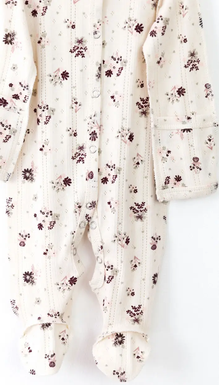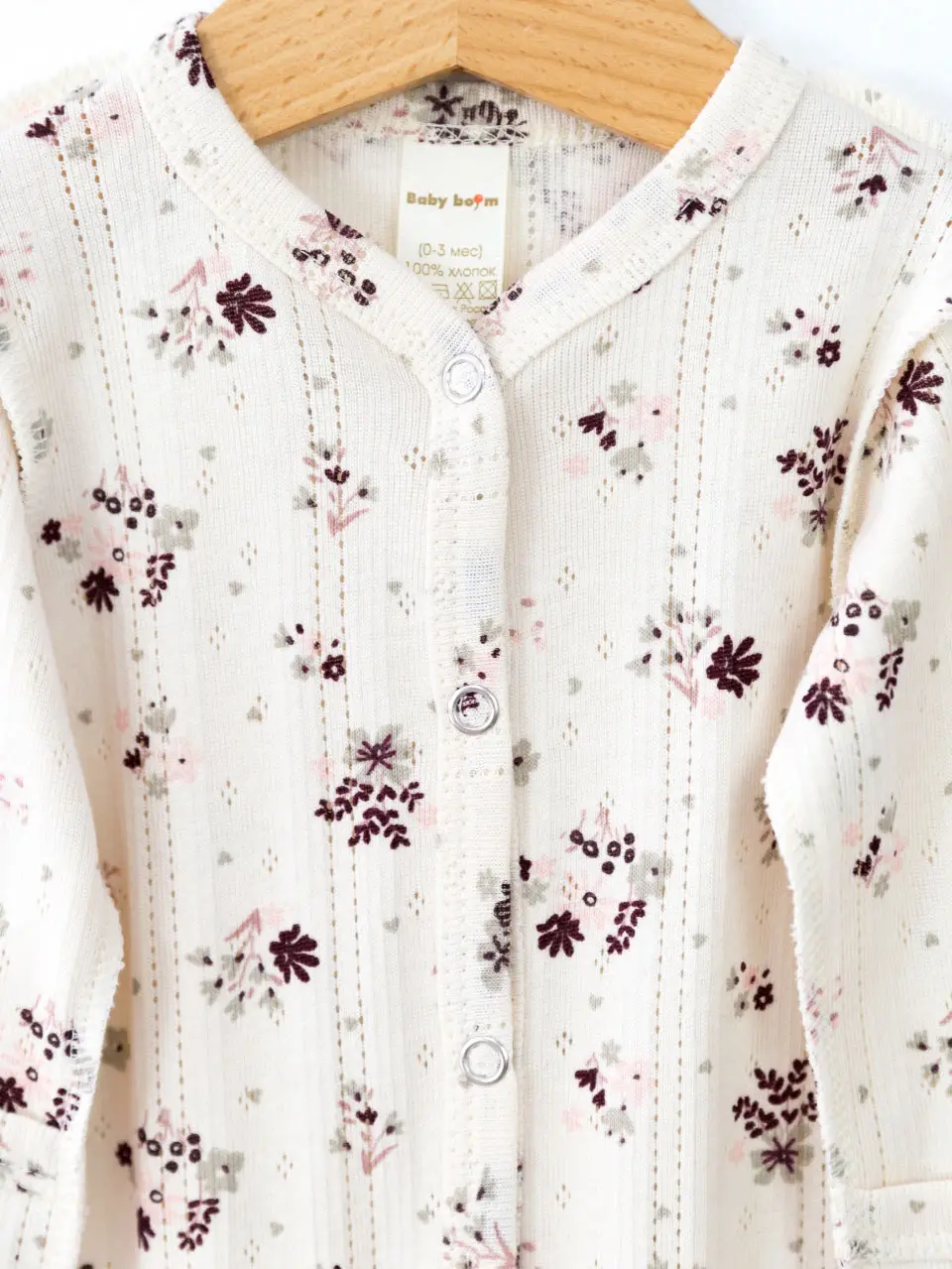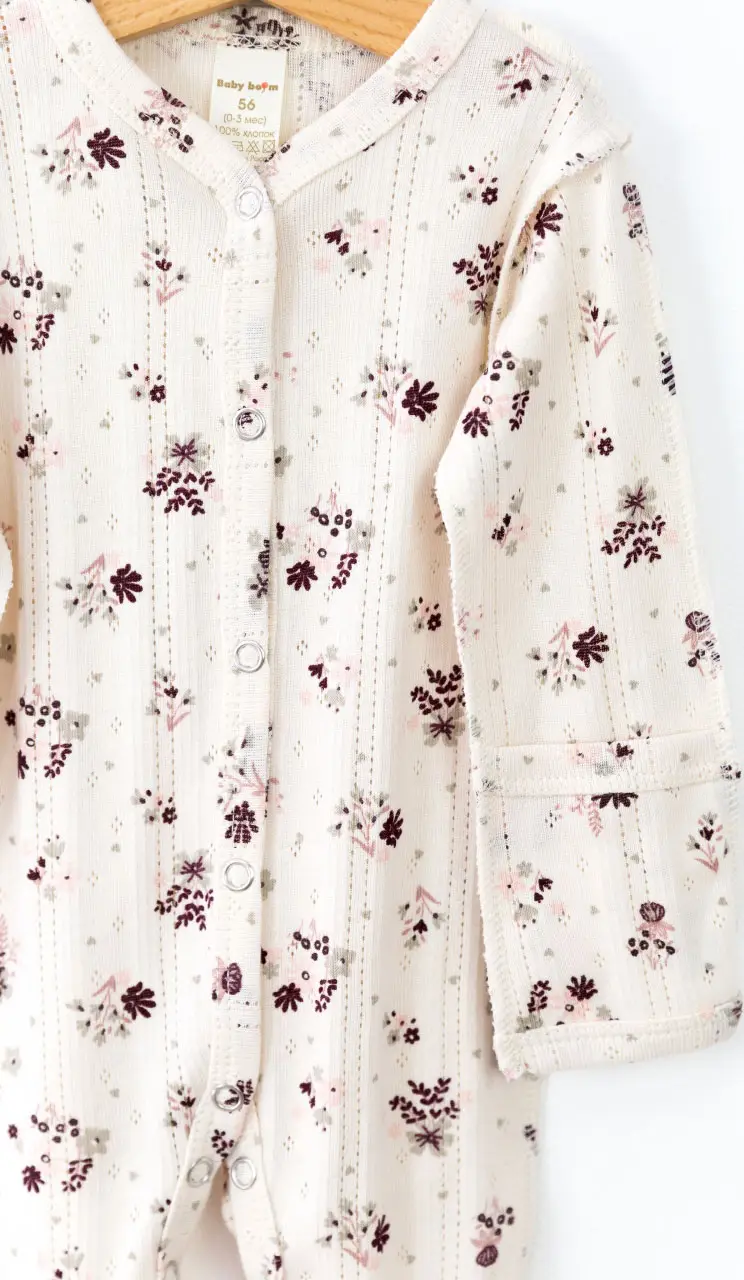 Комбинезон от бренда Baby boom выполнены швами наружу из нежной ажурной рибаны, 100% хлопок. За счёт рисунка, создаваемого дырочками, материал выглядит очень эффектно и нарядно. Благодаря материалу ползунки прекрасно сохраняют форму, способны выдержать большое количество стирок, не дают усадки, не покрываются катышками.