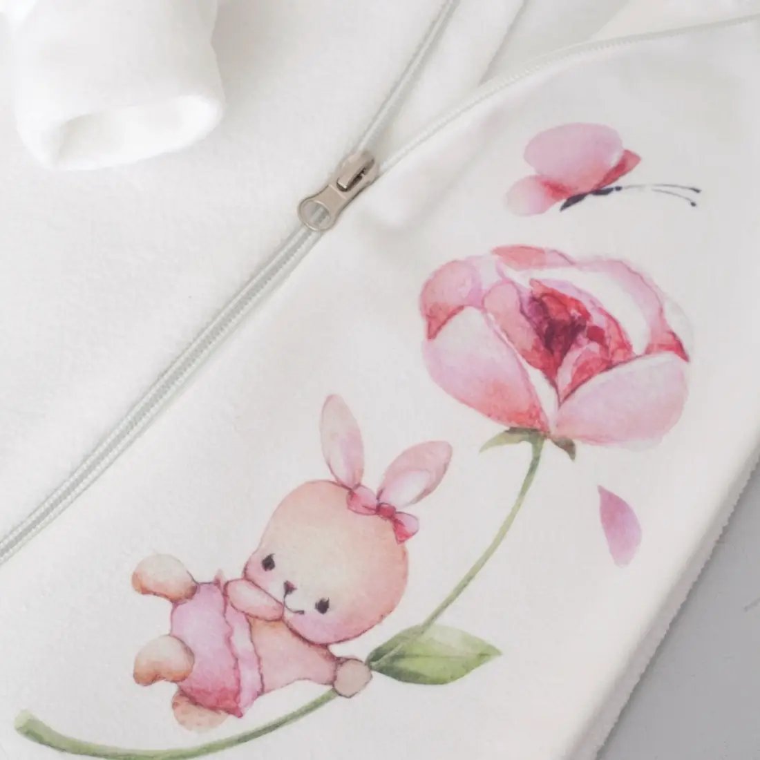 Комбинезон - поддева "Новые Друзья" с принтом зайчонка на грудке, с закрытыми ножками,на рукавах манжет. Молния на всю длину, делает процесс одевания малыша простым и удобным, а специальный клапан защищает подбородок от натирания и защимления.
