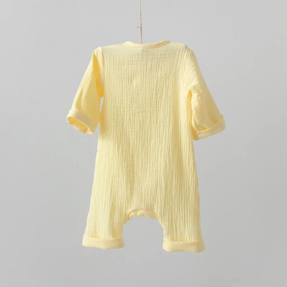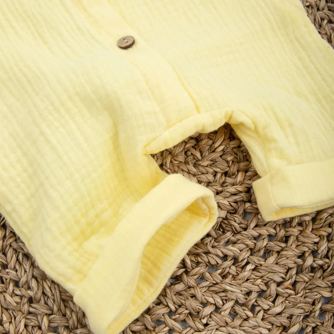 Комбинезон-слип Муслин – это летний комбинезон из хлопка, состоящий из 100 % муслина, с пуговицами по передней половинке и открытыми ножками.