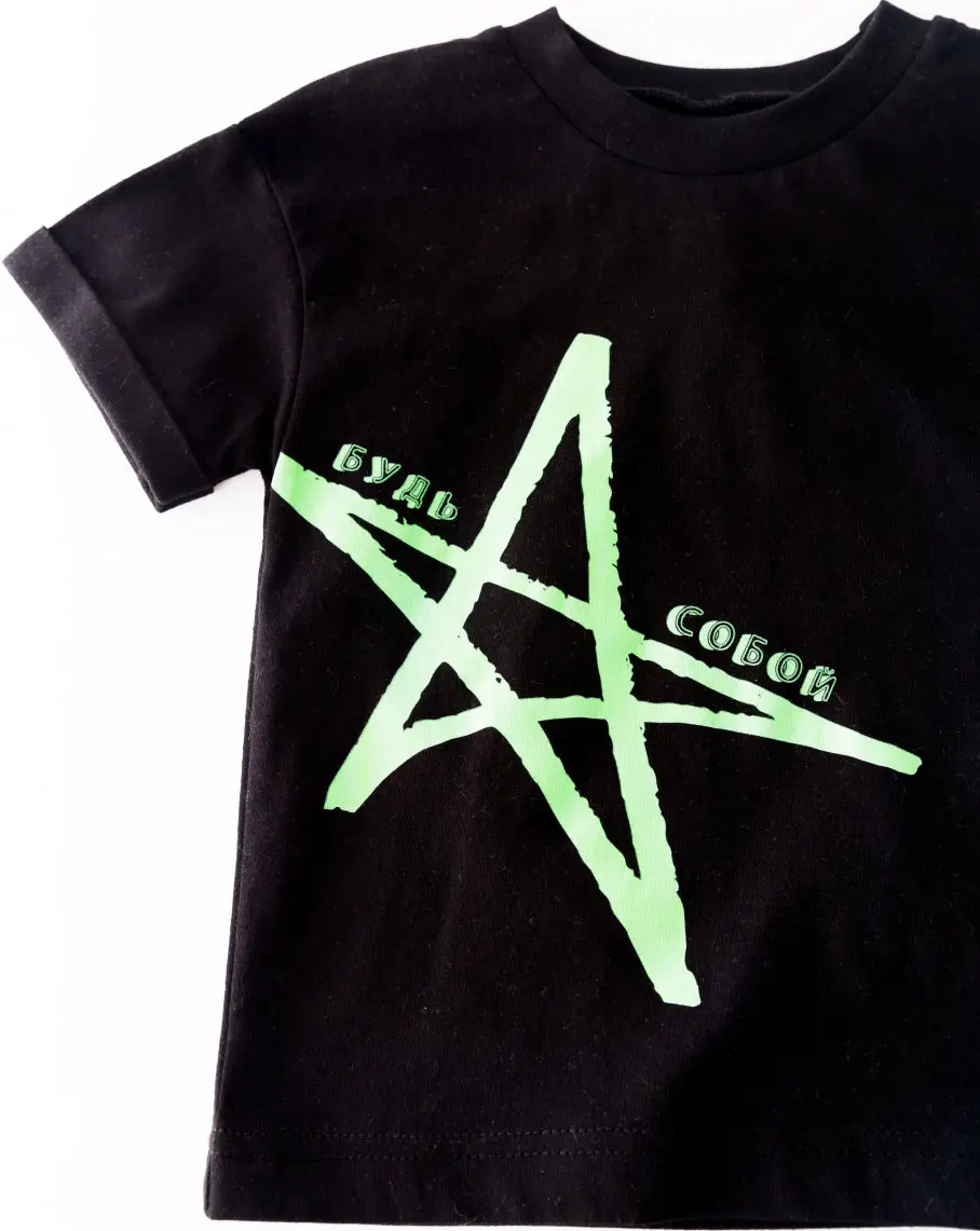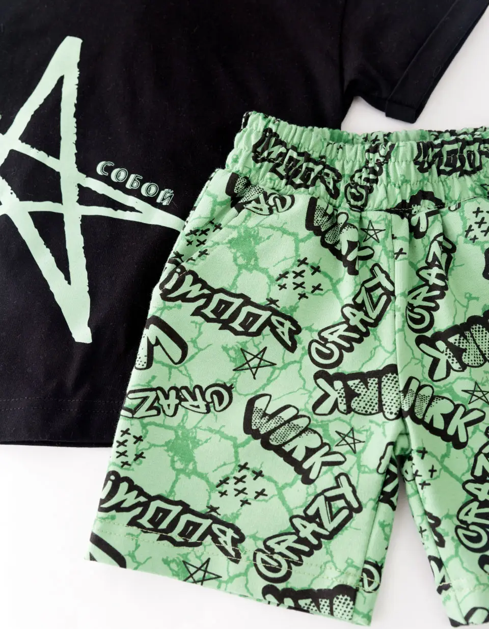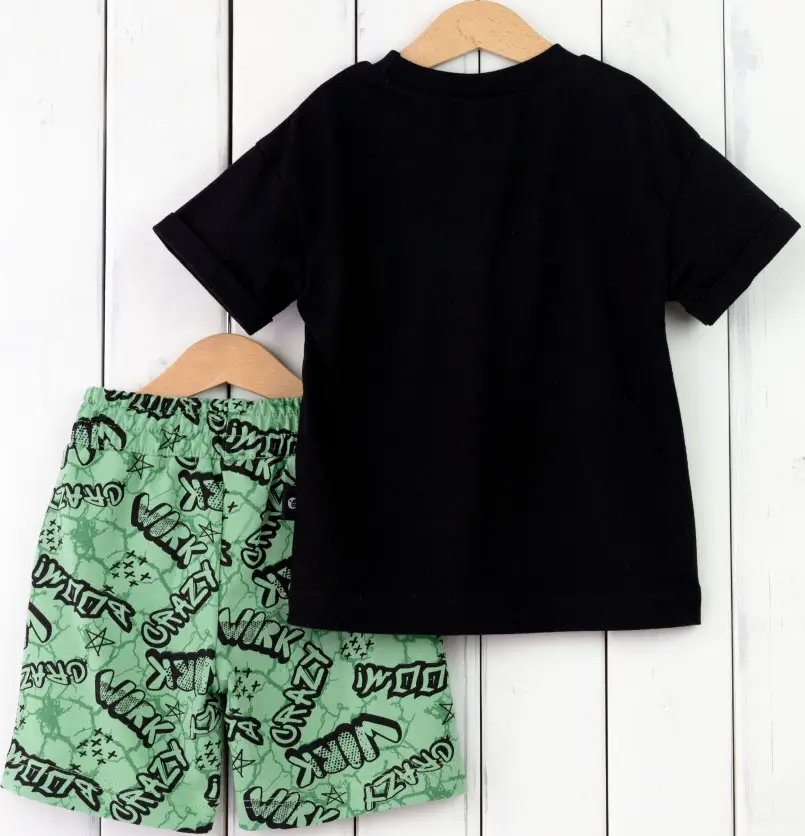 Детский комплект, чёрная футболка, зелёные шорты с надписью, р. 104, КД406/4-Ф