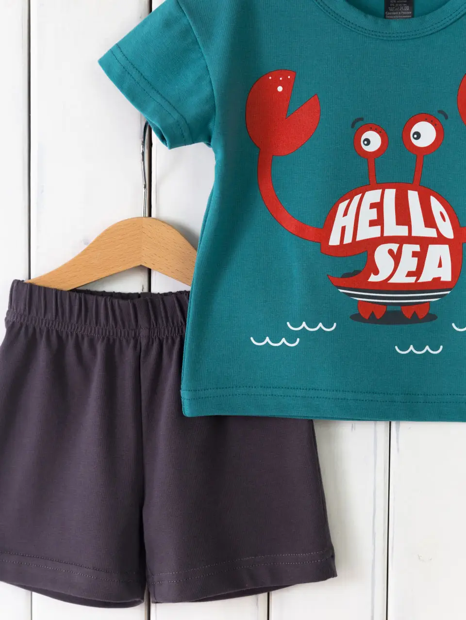 Детский комплект с морской тематикой от бренда Baby boom изготовлен из эластичной кулирки. Кулирный трикотаж комфортный в носке, благодаря...