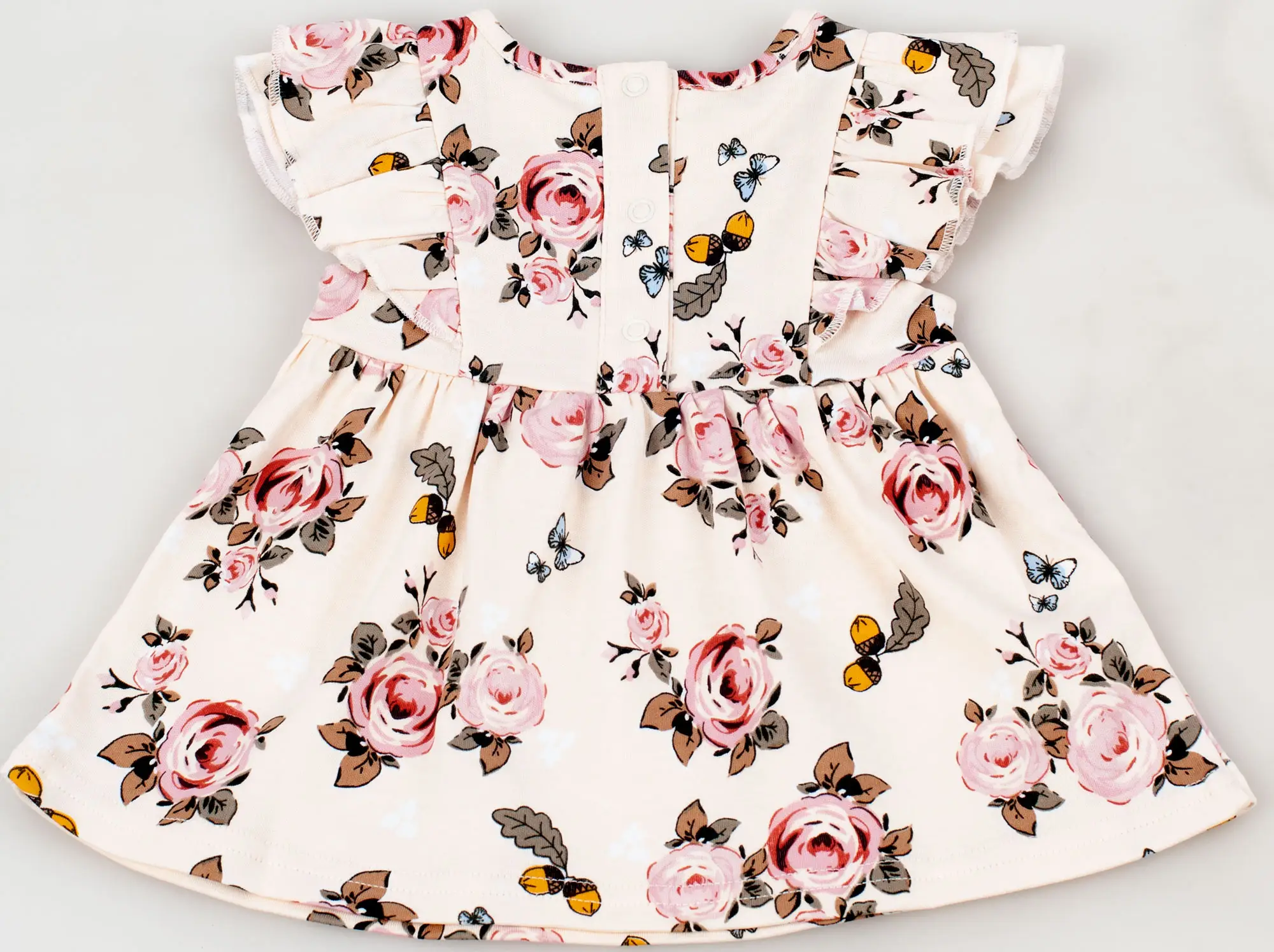 Комплект украшен нежным цветочным принтом. Комплект выполнены из мягкого материала, 100% хлопка. Комплект прекрасно подходит как повседневная детская одежда. Платье имеет кнопки-застёжки. Они не вредят ребёнку своими свойствами и случайно не поцарапают.