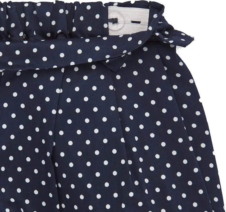 Летний костюмчик для девочки, состоящий из футболки и шорт. Мягкая эластичная хлопковая ткань. Легко надевать, есть кнопка на спинке. Футболочка декорирована милым принтом. Шортики в горошек на эластичном поясе для регулировки талии.