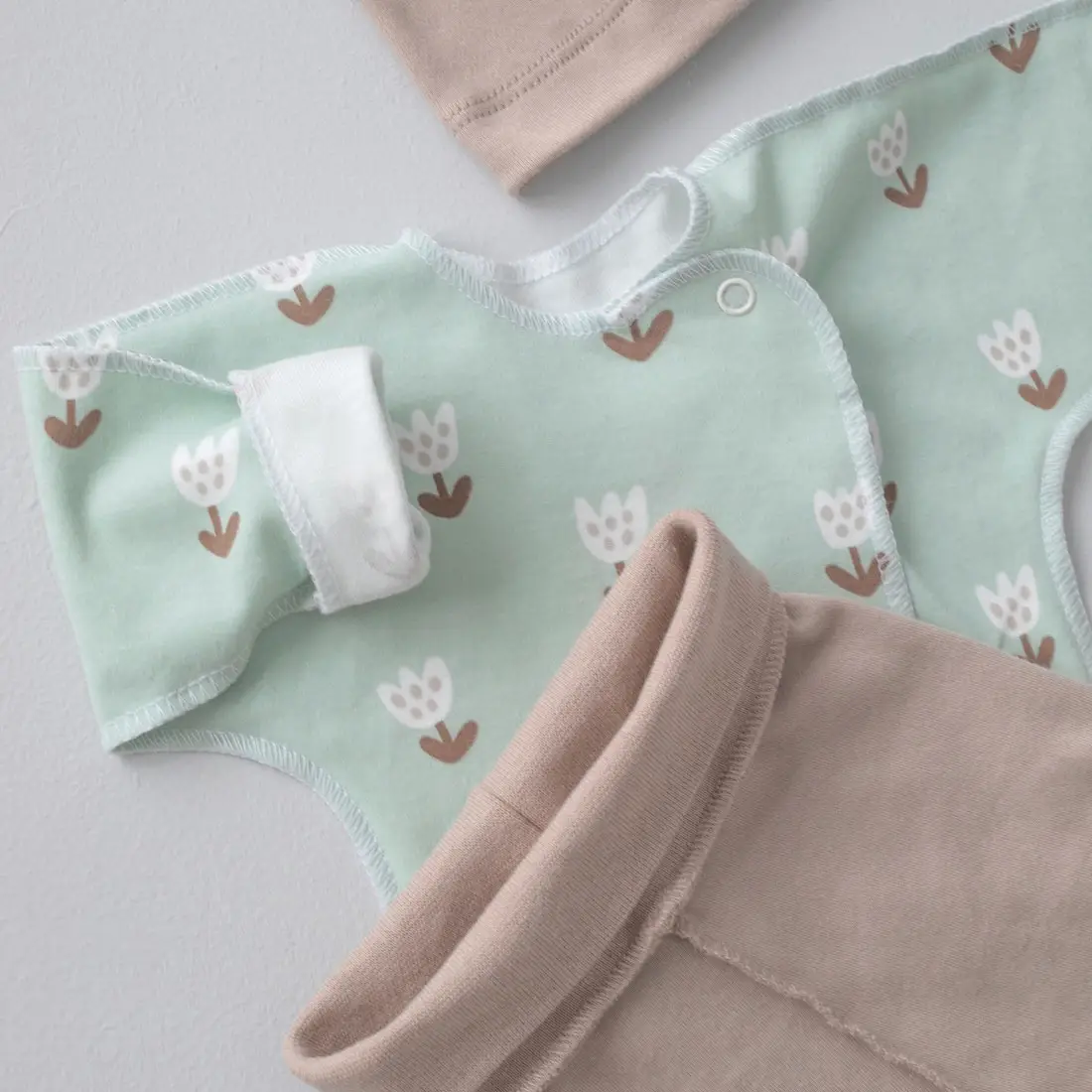 Комплект "Первые Цветы-1" от KiDi kids включает в себя три предмета: распашонку, ползунки и шапочку. Распашонка украшена яркими цветами, которые поднимут настроение малышу и его родителям. Ползунки изготовлены из мягкого и приятного к телу материала, они оснащены широким эластичным поясом и закрытыми ножками, что обеспечивает комфорт и свободу движений. Шапочка выполнена из лёгкого трикотажа и имеет манжет, который предотвращает сползание. Все предметы комплекта изготовлены из высококачественного трикотажа интерлок пенье, состоящего из 100% хлопка. Это гарантирует мягкость, гипоаллергенность и воздухопроницаемость изделий.