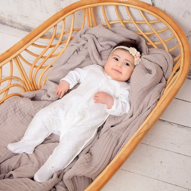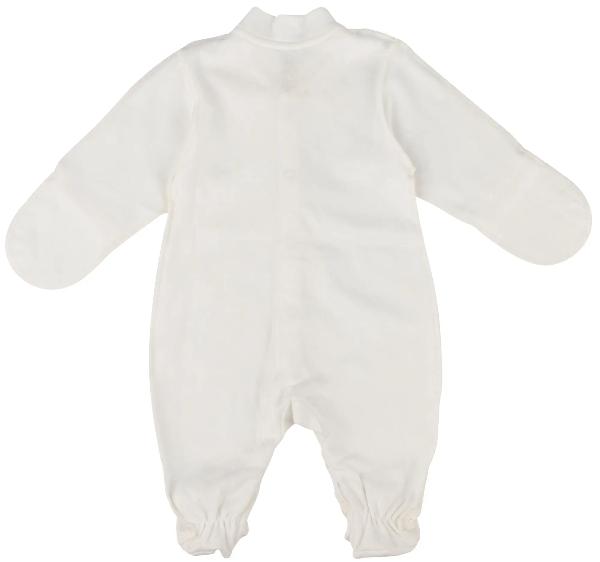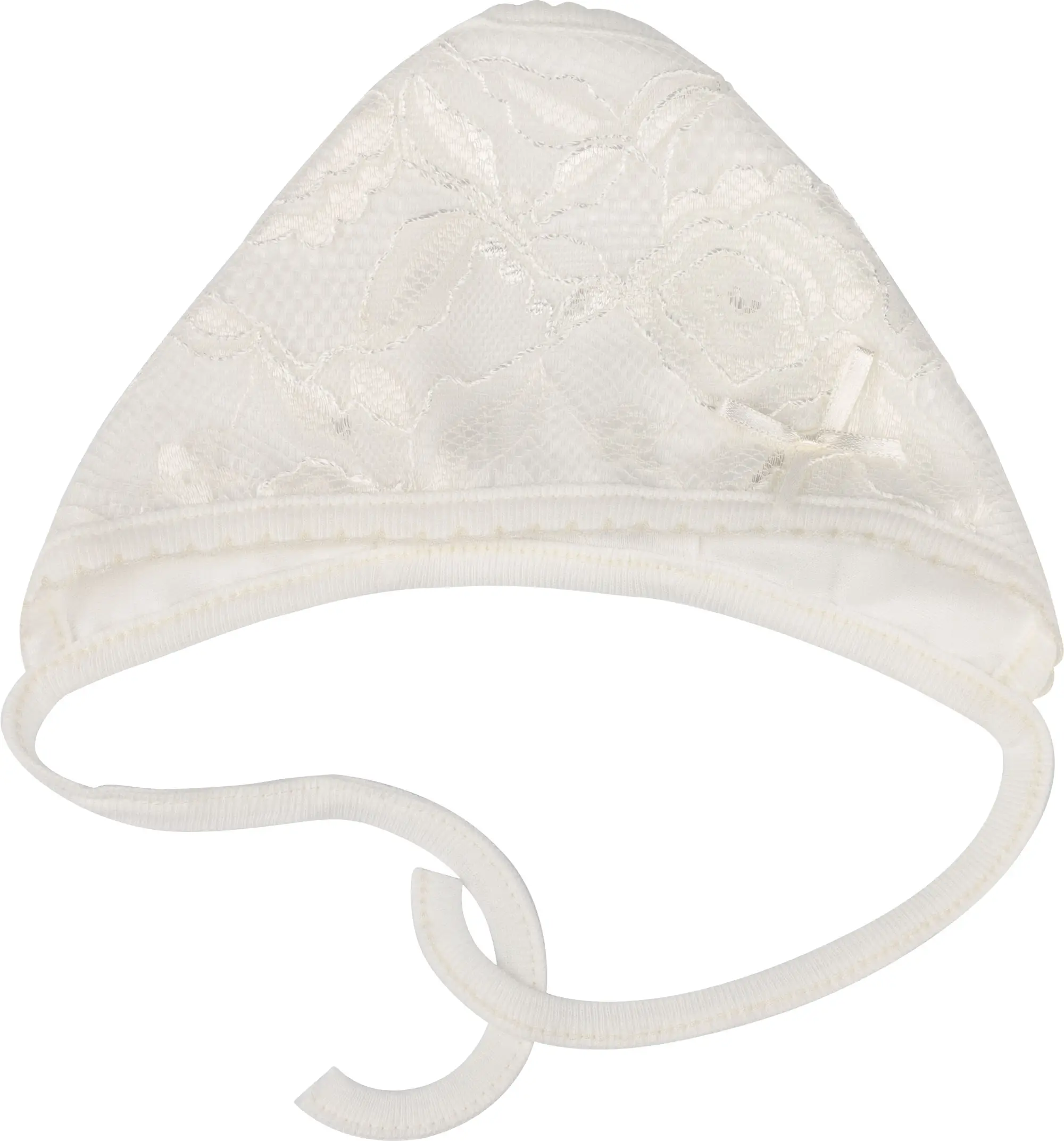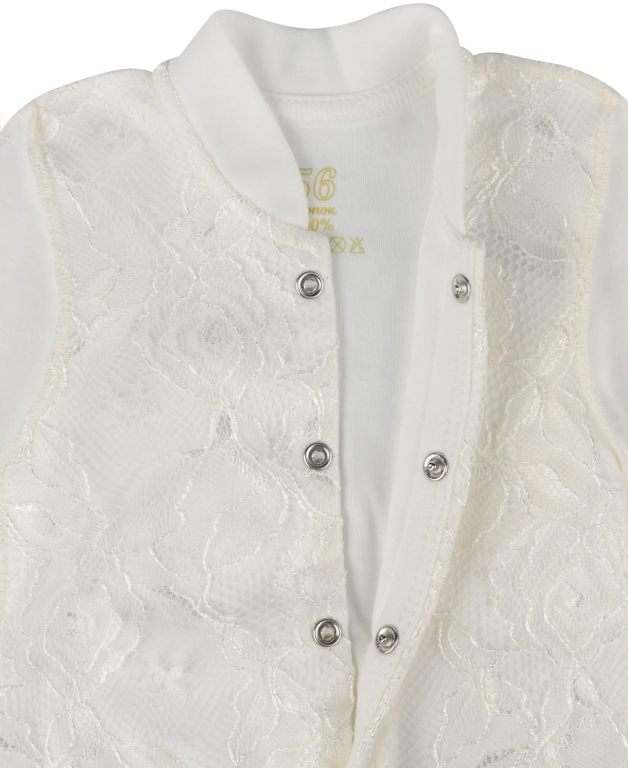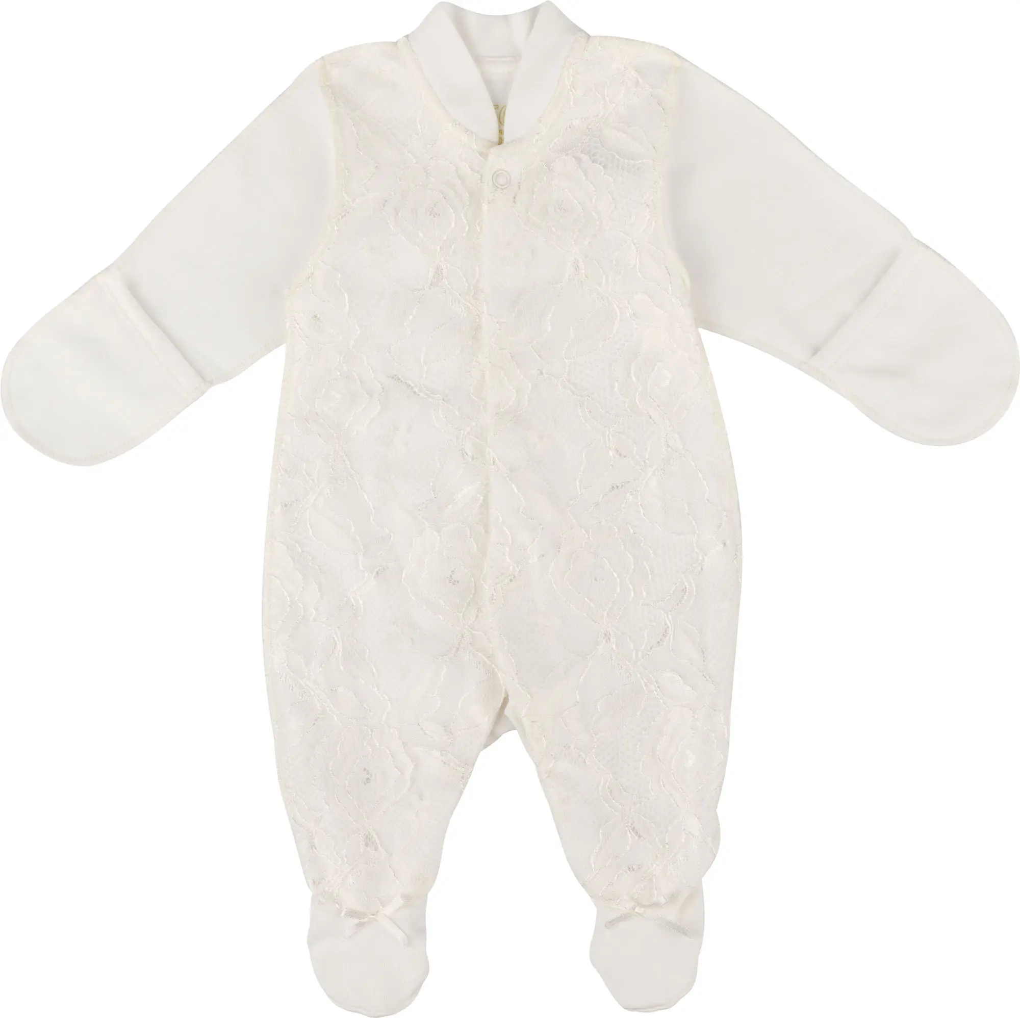 Комбинезон выполнен из 100% хлопка, швами наружу и украшен кружевом. Чепчик однослойный с завязками, со швами наружу.
