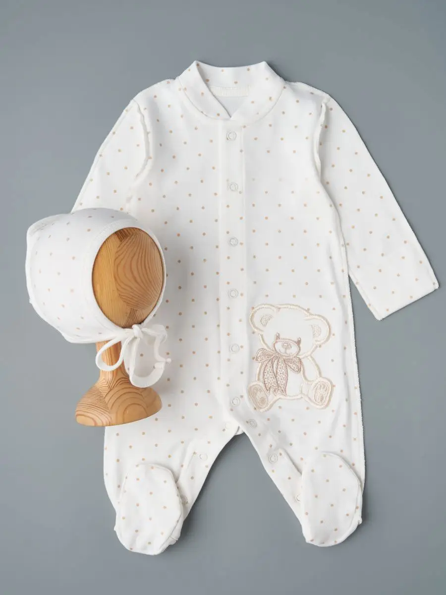 Комбинезон с чепчиком Мишка бант на бежевых горошках Little Star, р. 62, интерлок, крем
