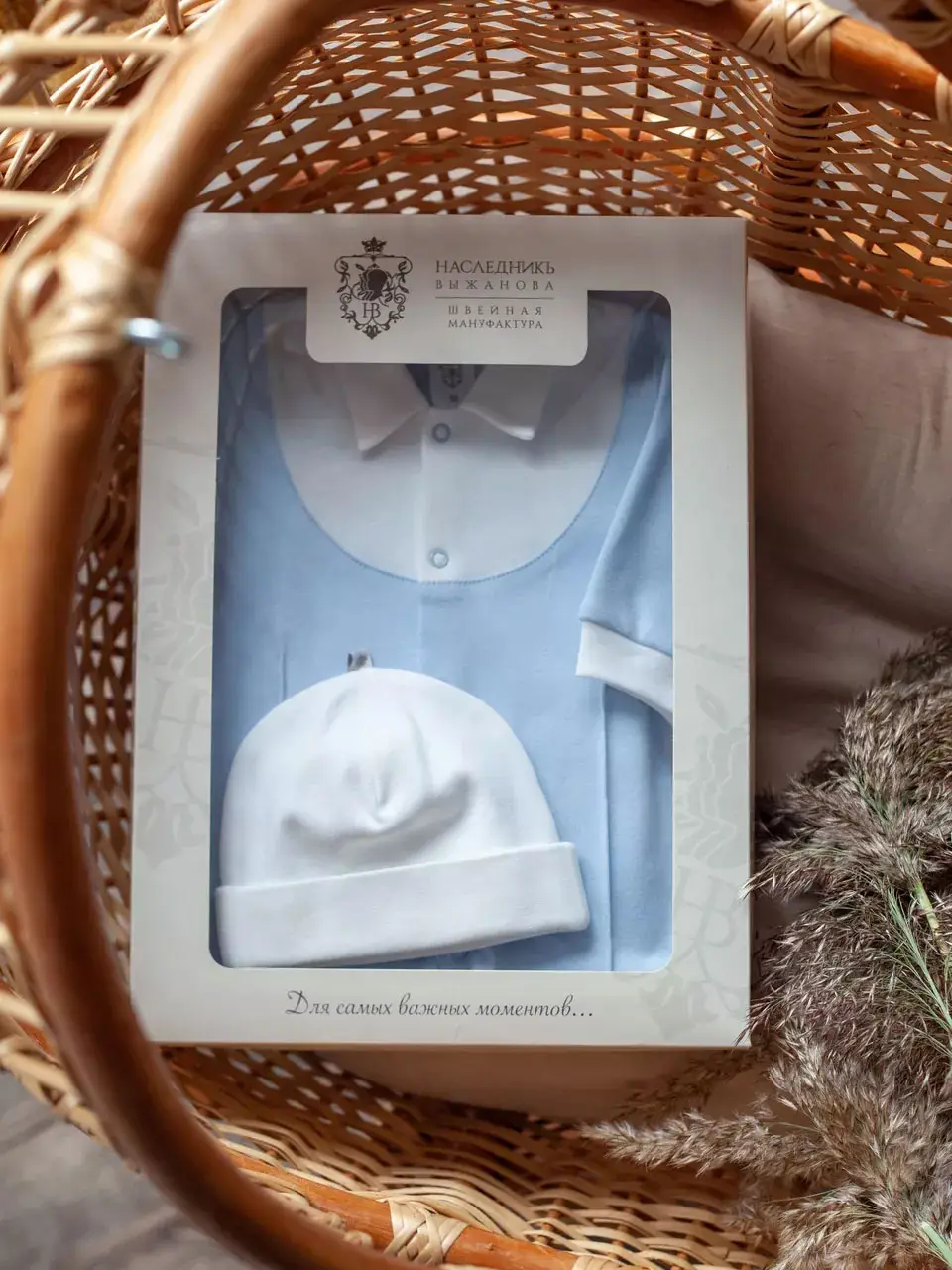 Нежный комплект от Наследник Выжанова выполнен из хлопка высочайшего качества. Комбинезон застёгивается от воротничка до ножек на удобные застёжки-кнопки.