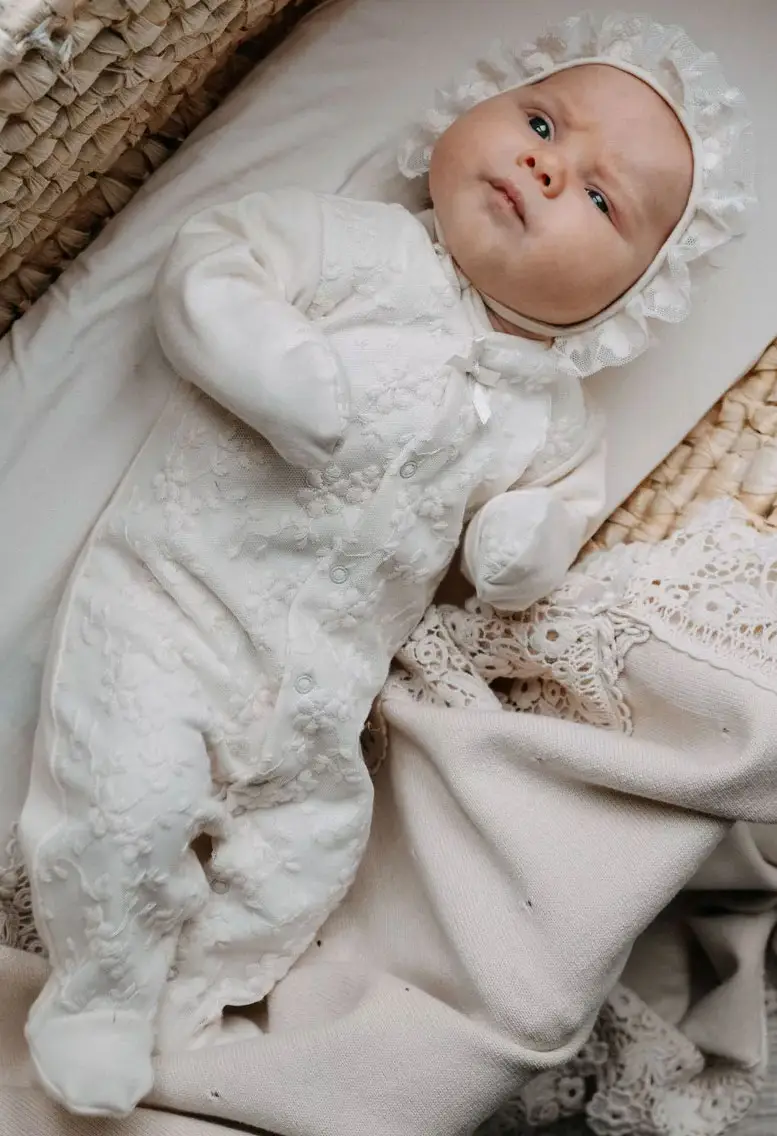 Комплект от бренда Наследник Выжанова выполнен из натурального органического хлопка. Изысканный и комфортный комплект отлично пойдет на выписку или для прогулок. В комплект входит комбинезон и чепчик, украшенный нежным натуральным кружевом. Конструкция комбинезона продумана так, что малышу в нем будет максимально комфортно.