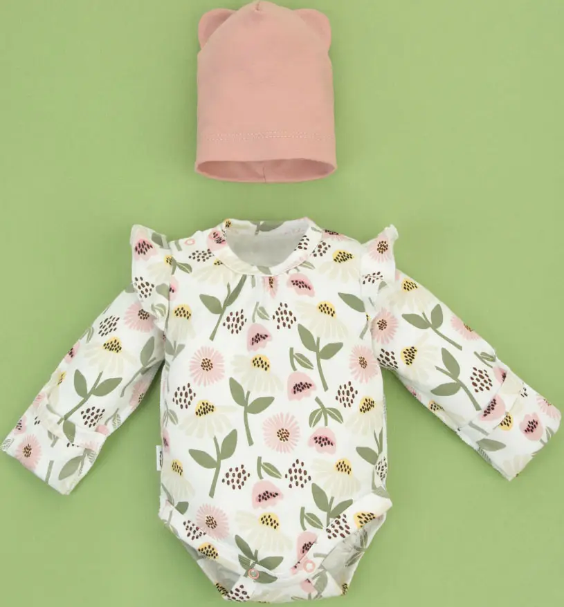 Комплект из трёх предметов "Любимые ромашки-3" от KiDi kids включает в себя боди с крылышками, штанишки с юбочкой и шапочку. Все предметы выполнены из высококачественного трикотажа интерлок-пенье, состоящего из 100% хлопка.