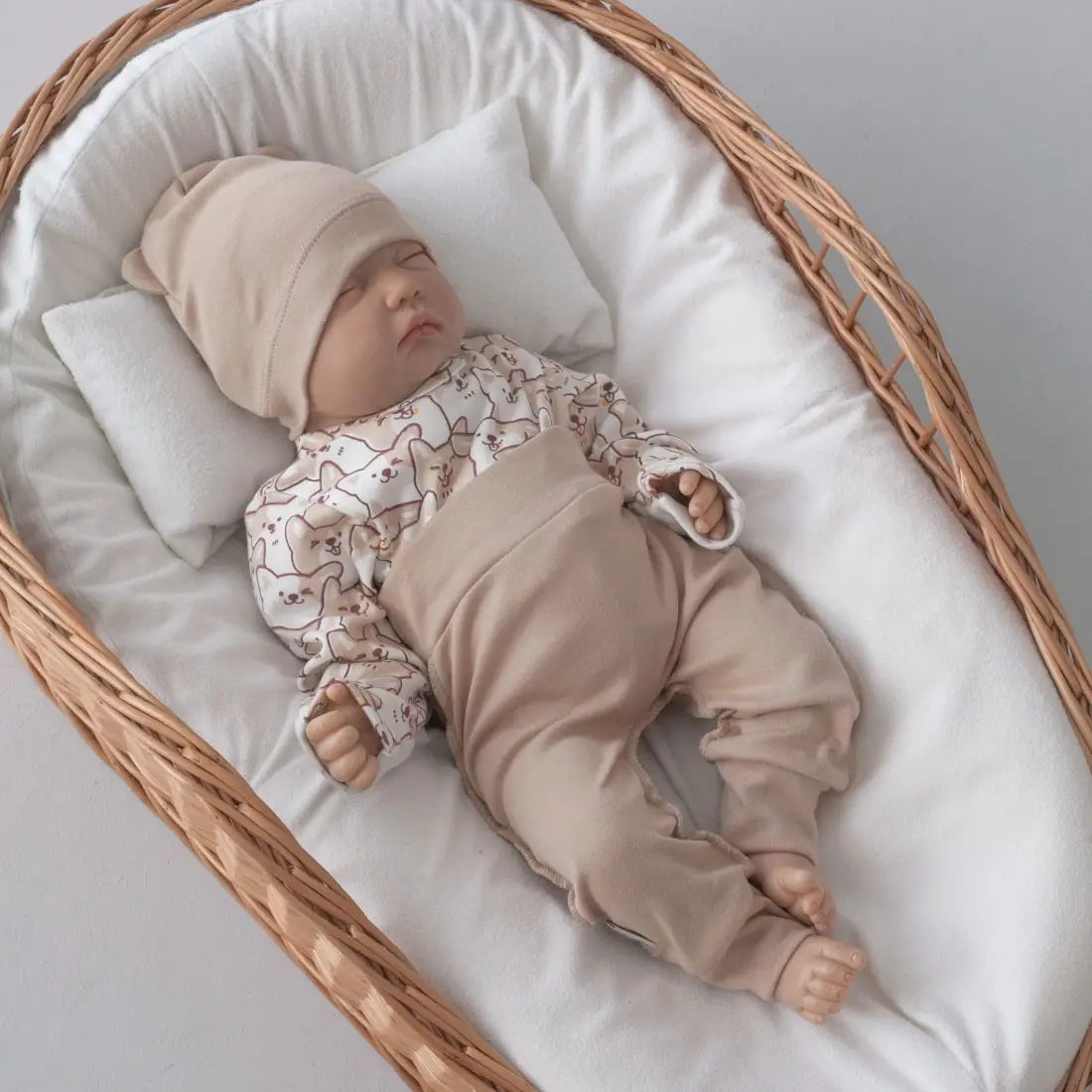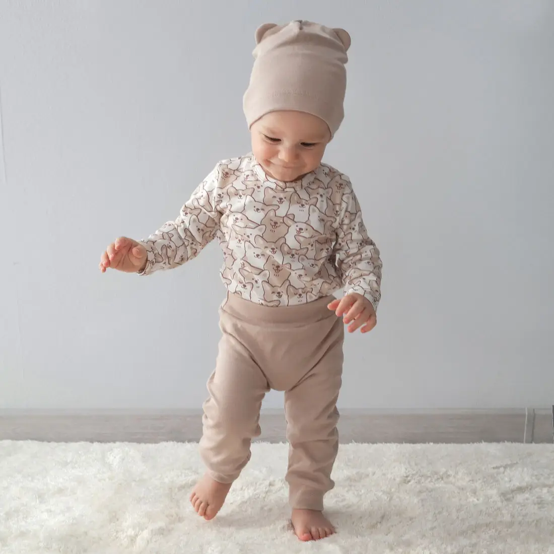 Комплект из 3-х предметов – боди на кнопках из интерлока дополнен шапочкой и штанишками. Такой комплект отлично подойдёт для повседневной носки и будет великолепно смотреться на вашем малыше.