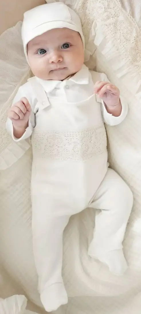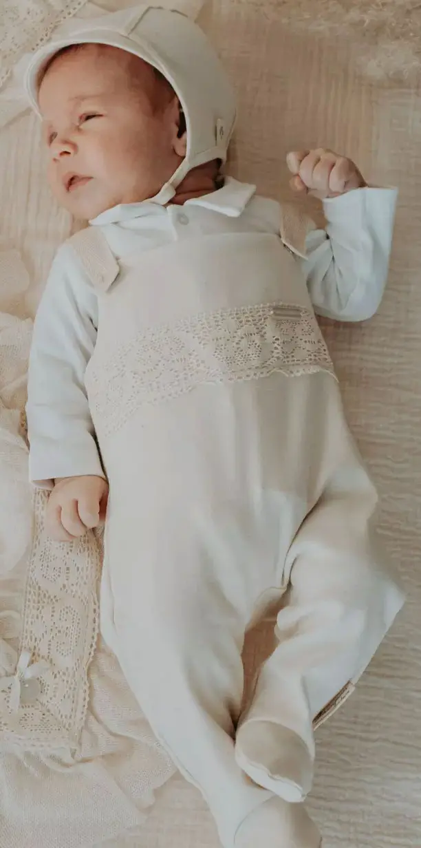 Комплект от бренда Наследник Выжанова выполнен из натурального органического хлопка. Изысканный и комфортный комплект отлично пойдет на выписку или для прогулок. В комплект входит кбоди с длинным рукавом, полукомбинезон, украшенный хлопковым кружевом и чепчик с козырьком. Конструкция комбинезона продумана так, что малышу в нем будет максимально комфортно.