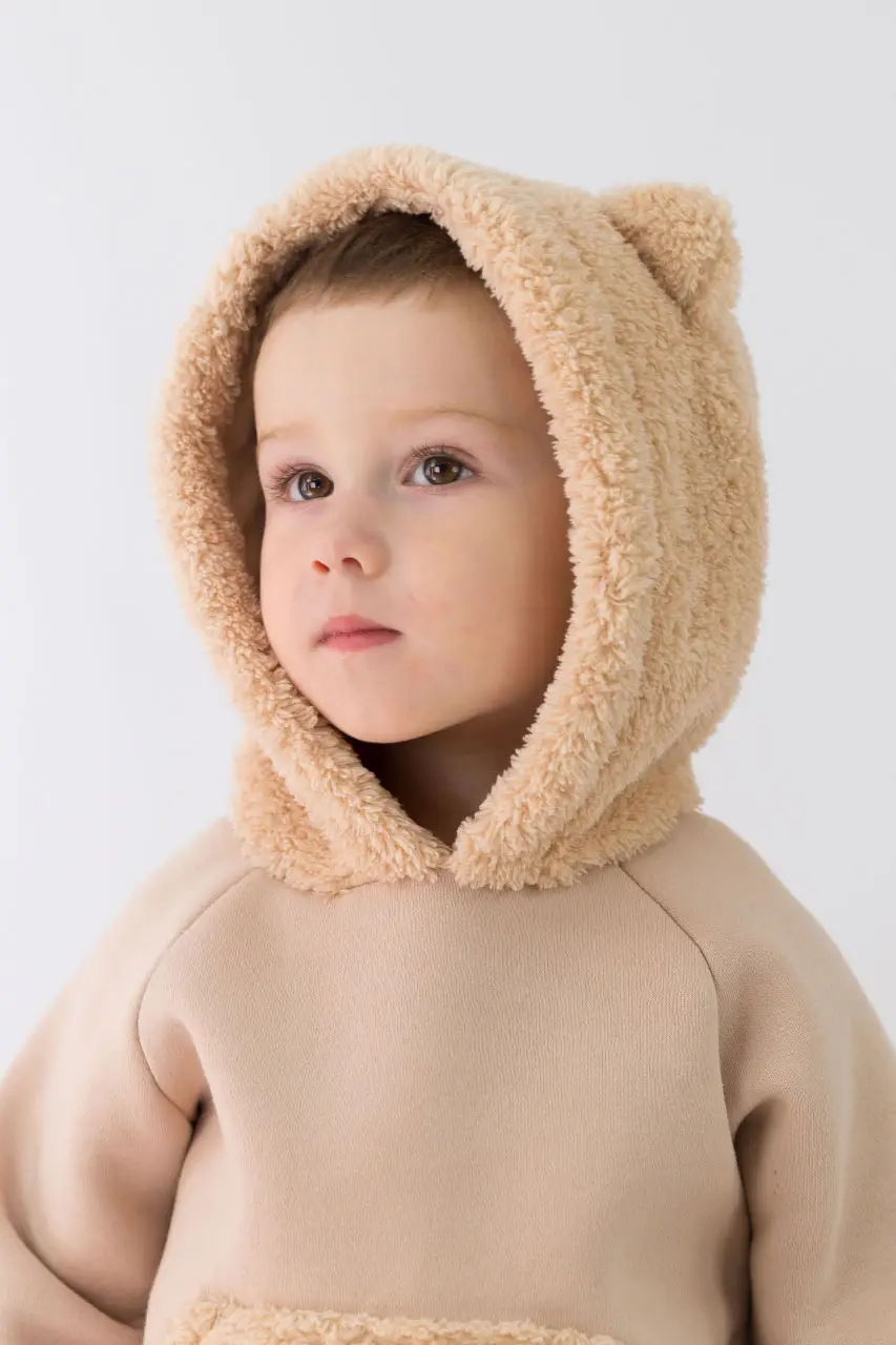 Удобный комплект для малыша – джемпер и брюки. Такой комплект отлично подойдёт для повседневной носки и будет великолепно смотреться на вашем малыше, идеален для холодных зимних дней. Капюшон с ушками и карманом-кенгуру из пушистого велсофта делают этот комплект невероятно уютным.