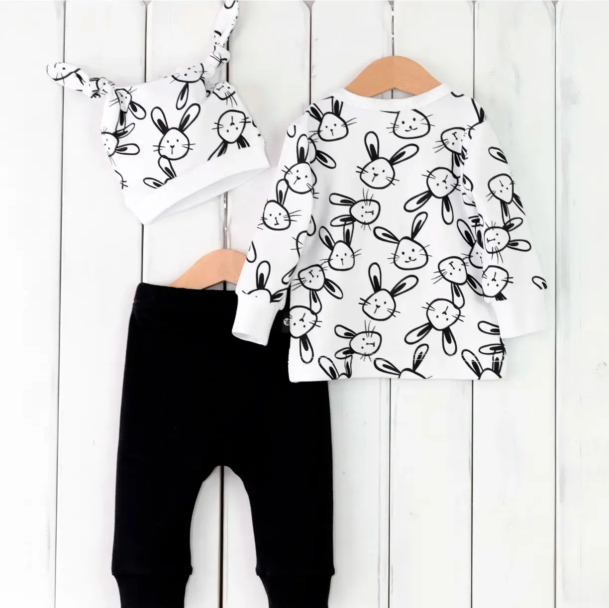 Комплект детский Baby boom, р. 68, лонгслив, шапка с зайцами на белом, брюки чёрные